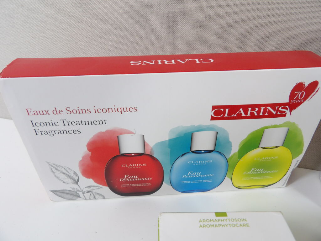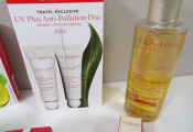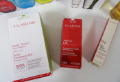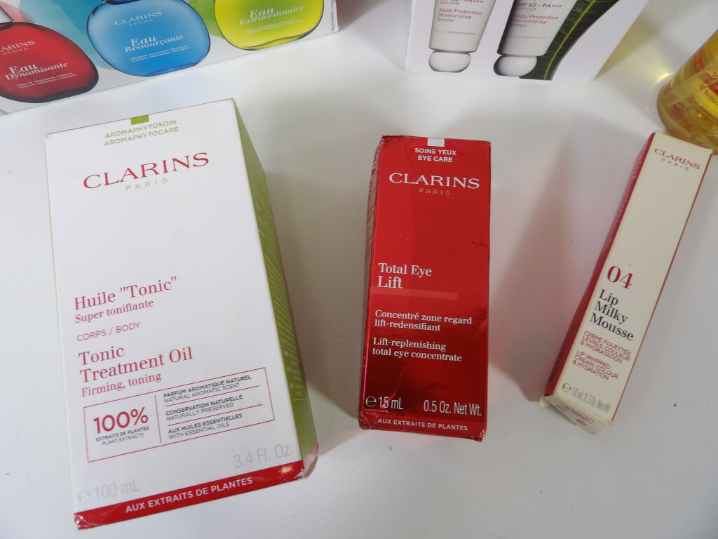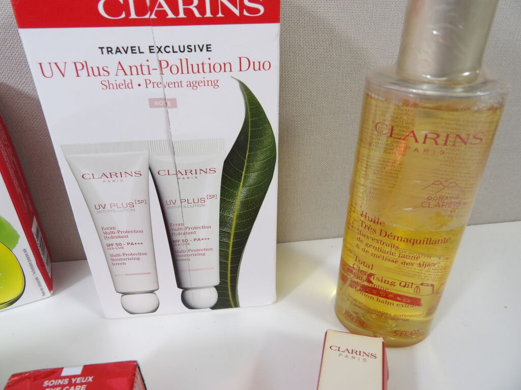 CLARINS : Lot de x6 articles (neuf et occasion / emballages abimés) : Huile Tonic, Concentré zone regard, Huile démaquillante, Duo UV Plus Anti Pollution, crème fouettée lèvres, Eaux de soins iconiques.