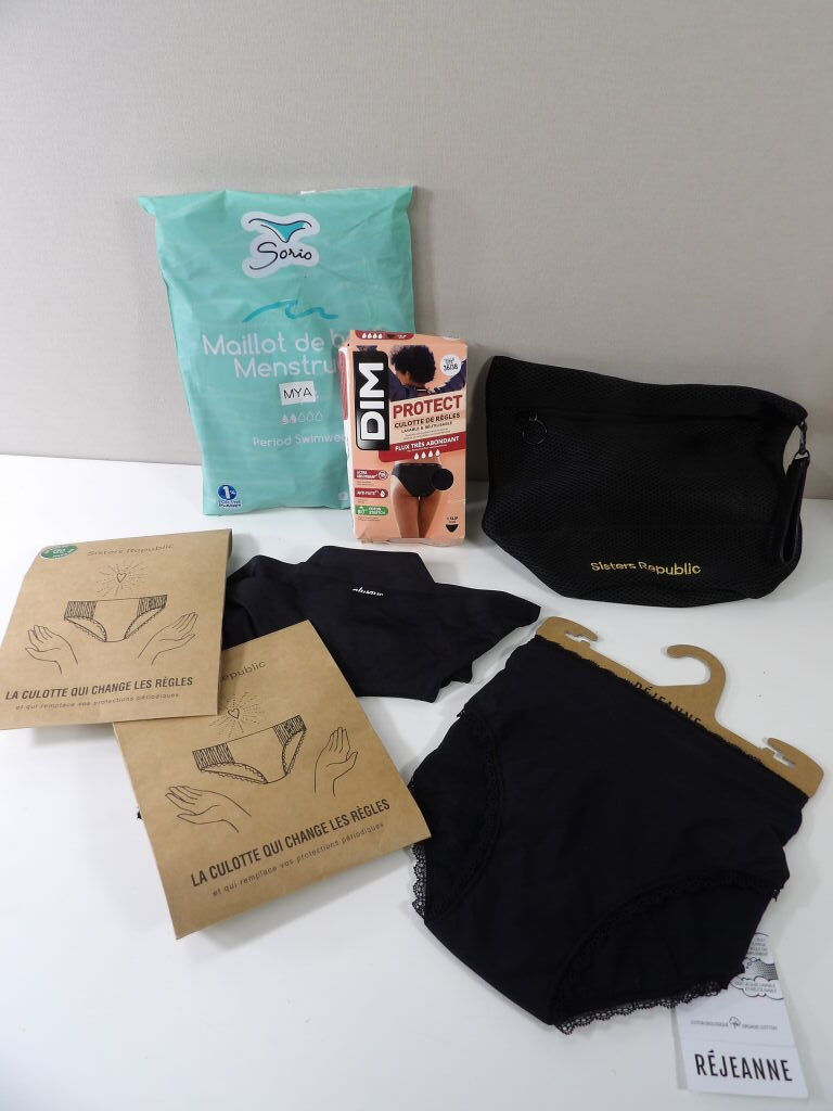 Culottes Menstruelles : Lot de x6 NEUVES Taille 36/S : REAJANNE culotte x1; Always x1, Dim x1, et en bas de maillot : Sisters Republic x2 Bas de maillot Ariel; et Sorio x1. On y inclut une housse filet pour les nettoyer de Sisters Republic.
