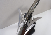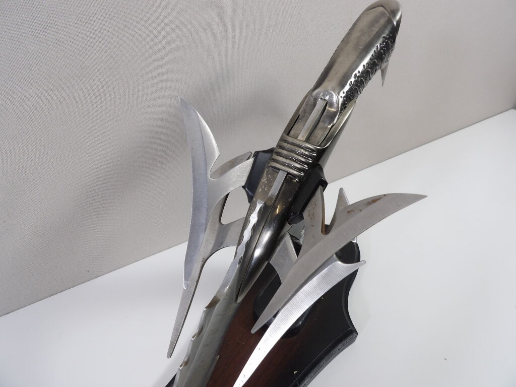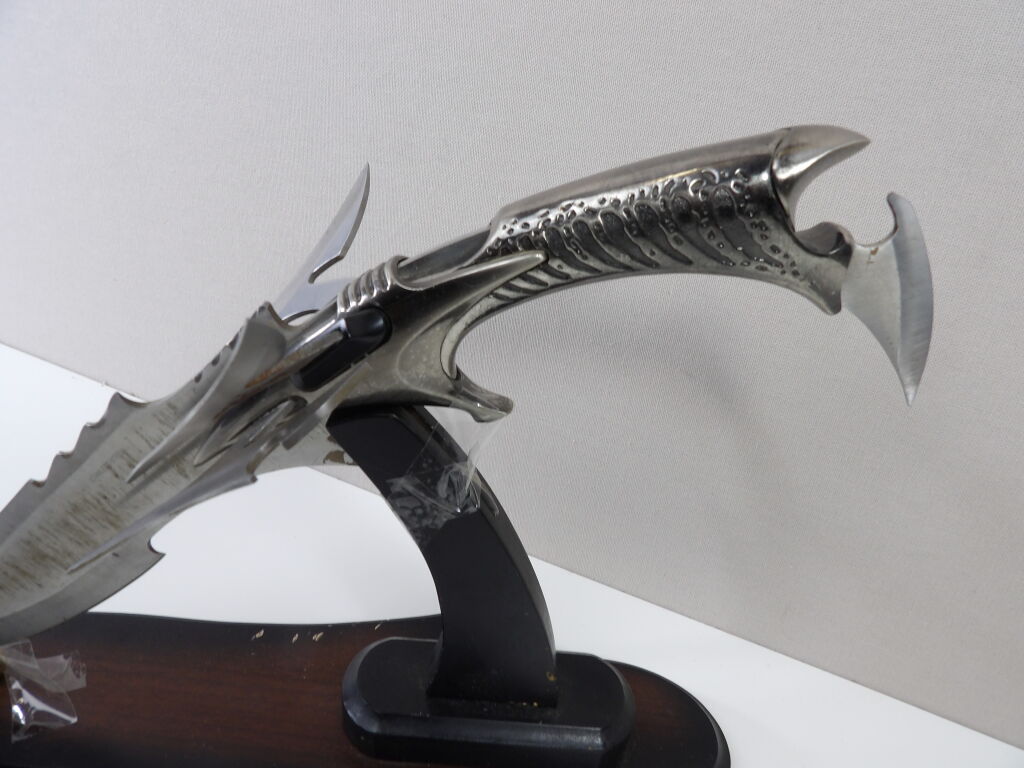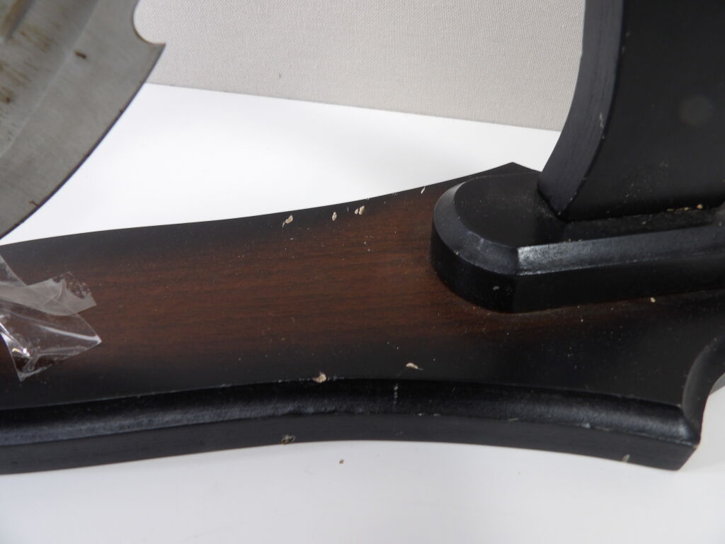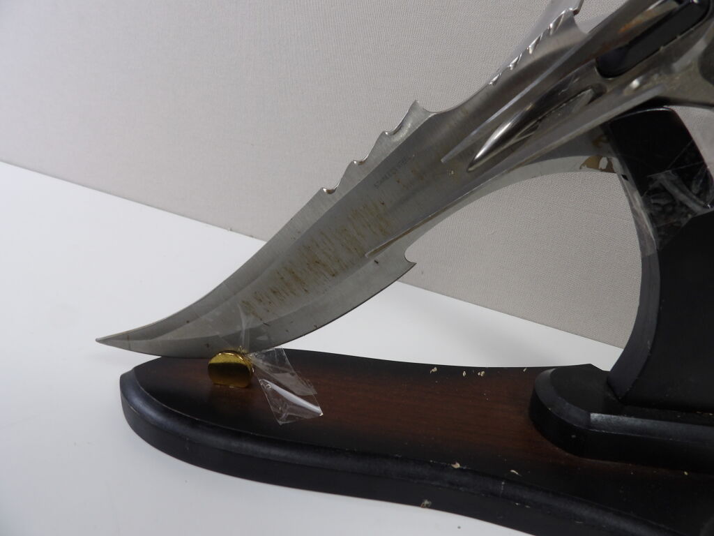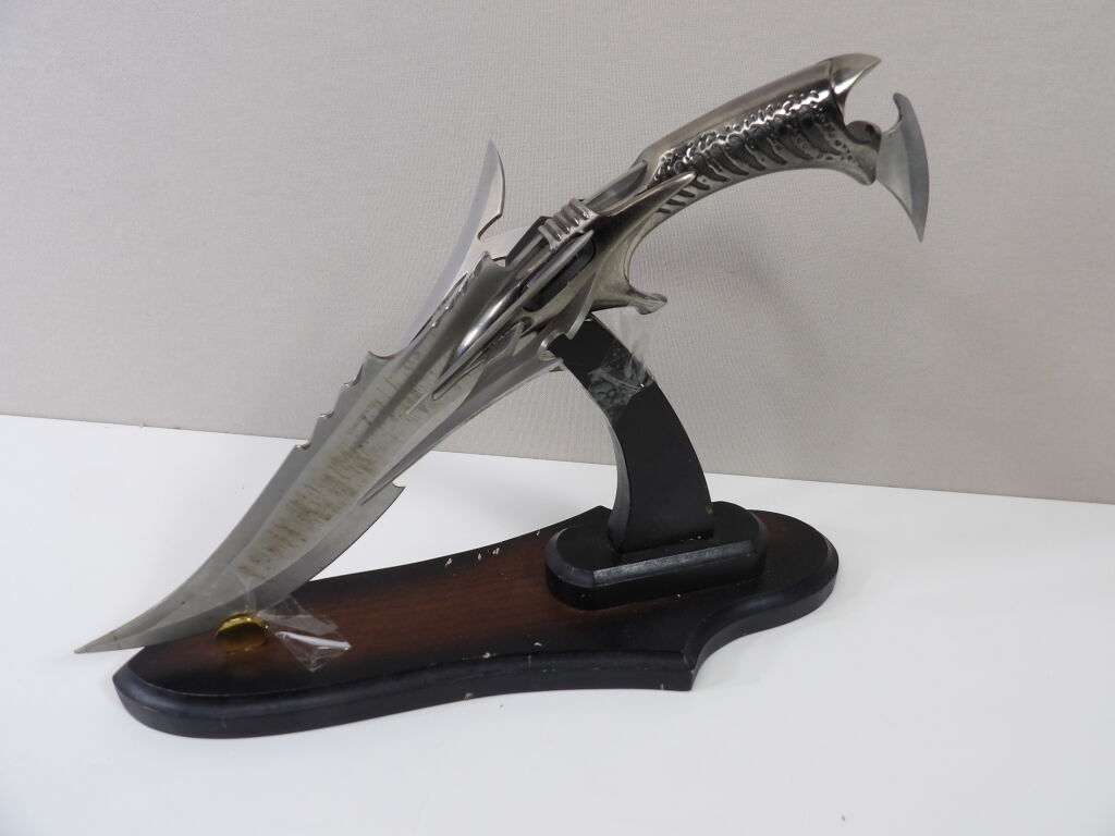 Dague en métal, de collection décorative (nettoyage à prévoir, marques sur le socle en bois