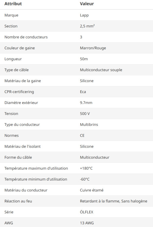 Eléctricité : Câble d'alimentation NEUF ! Lapp Multiconducteur souple 3G2,5 mm² CE, Marron/Rouge, 50m, Retardant à la flamme, Sans halogène. Code RS: 714-2325 - Caractéristiques techniques sur la dernière photo.