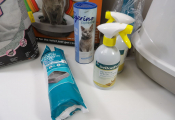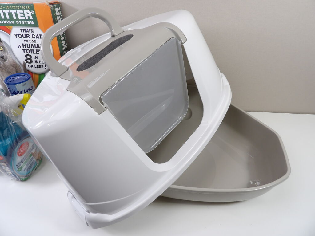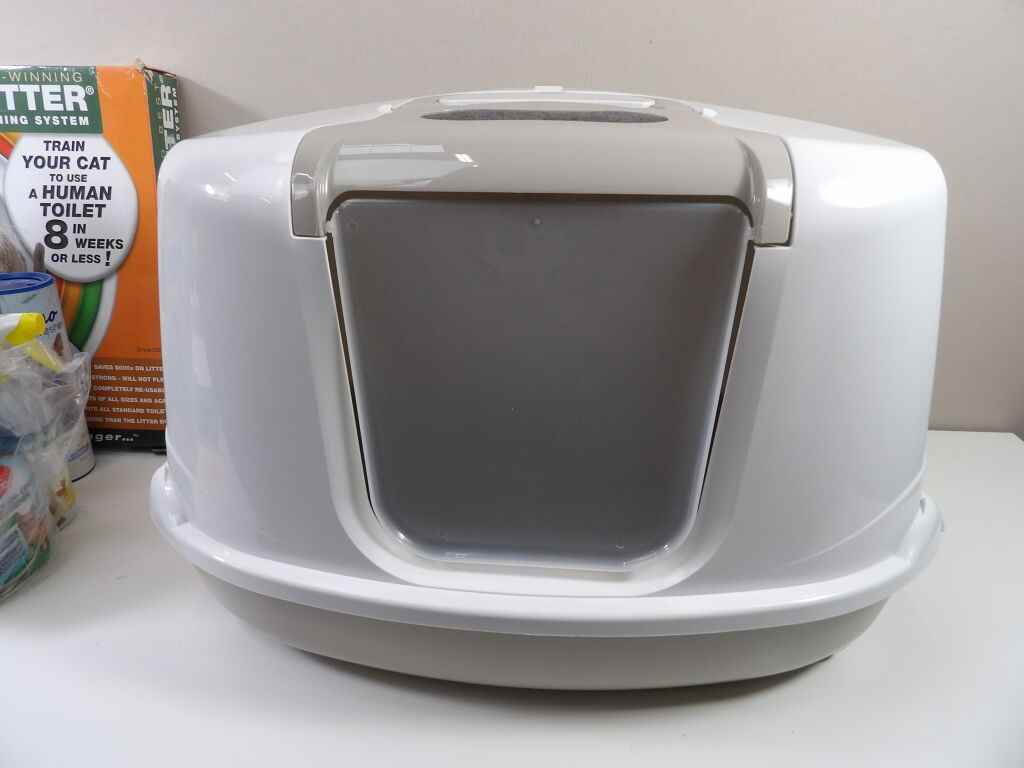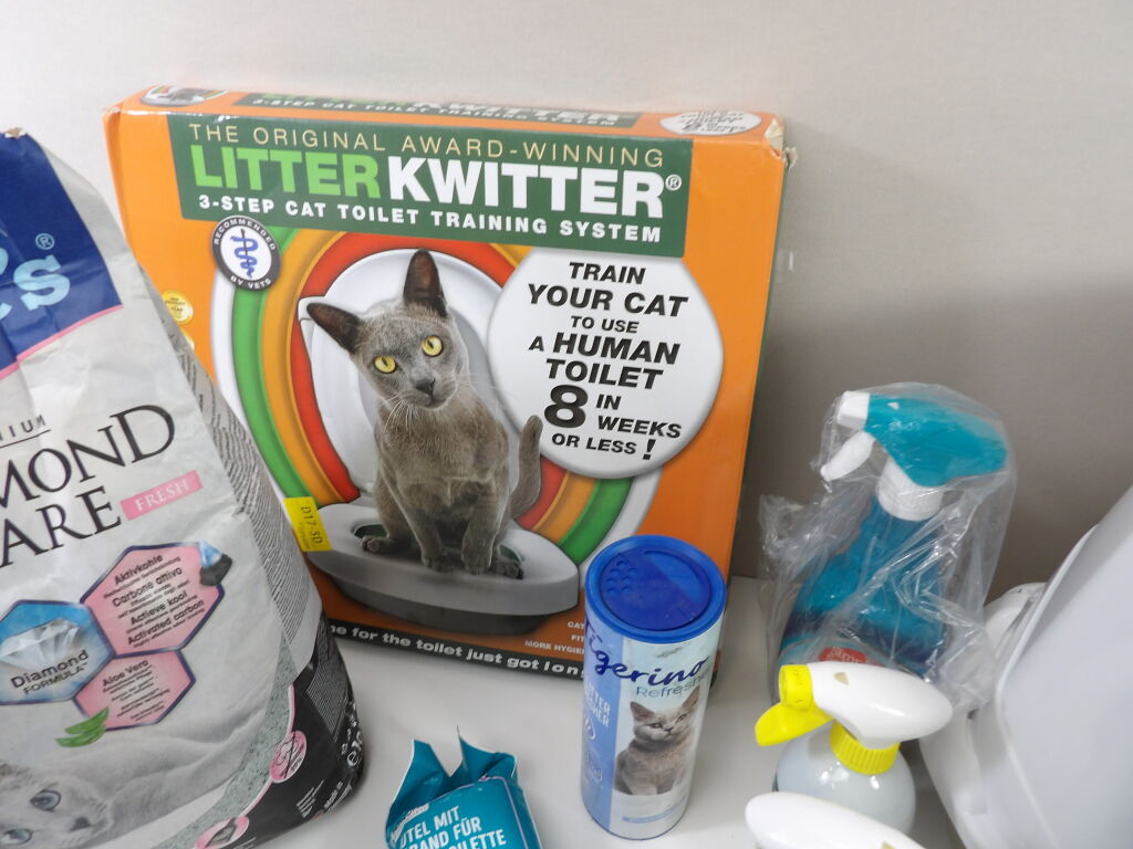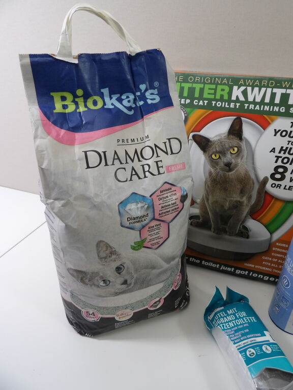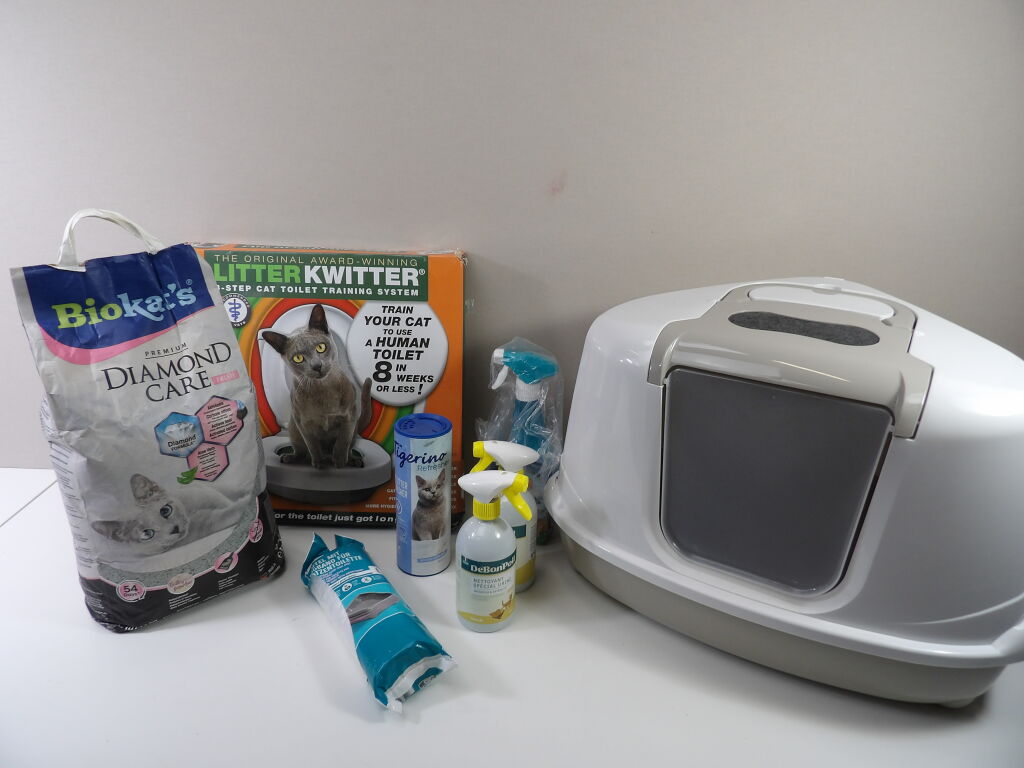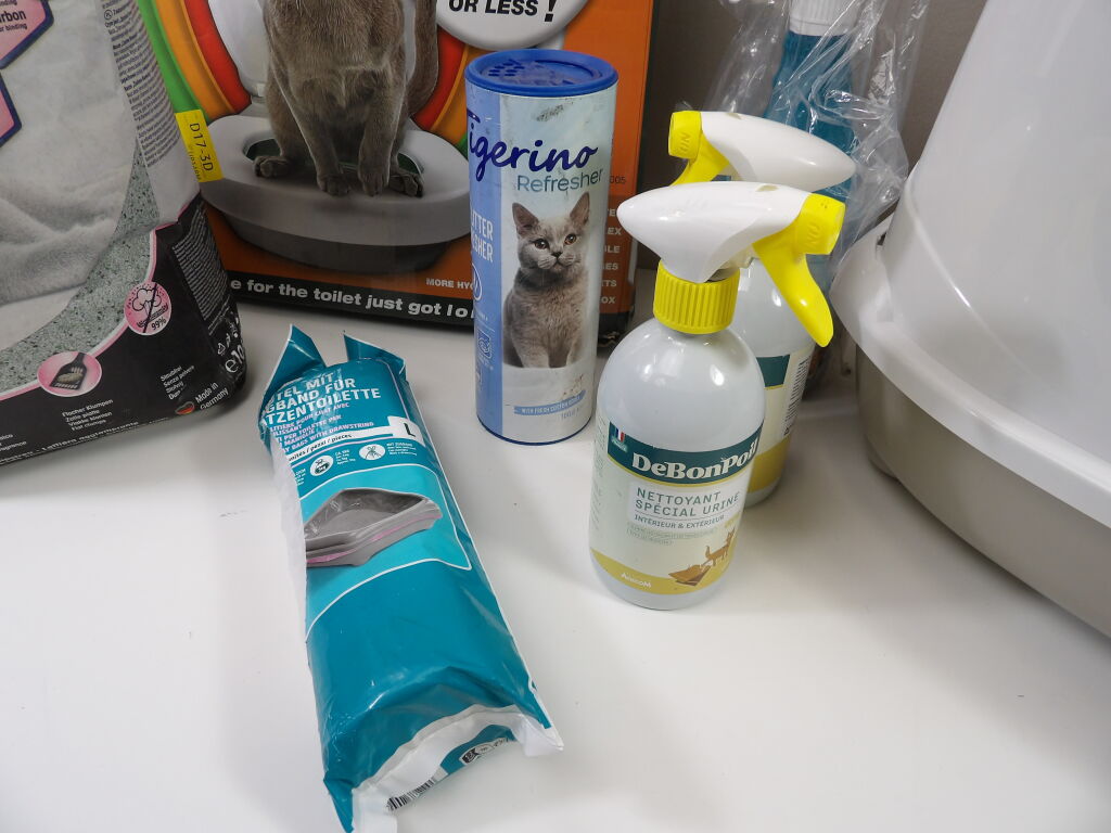 LITIÈRE pour CHAT : Lot de x8 articles (neuf et occasion) : Litière, Kit de toilette, sacs poubelles pour litière, x3 produits nettoyant et un sachet de 10 litres.