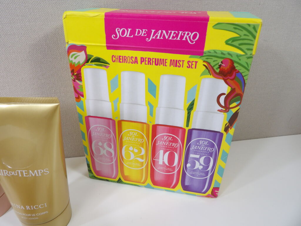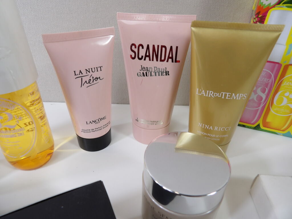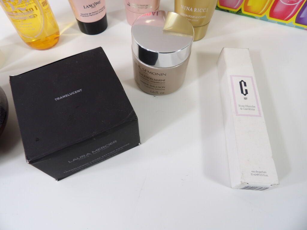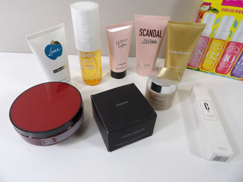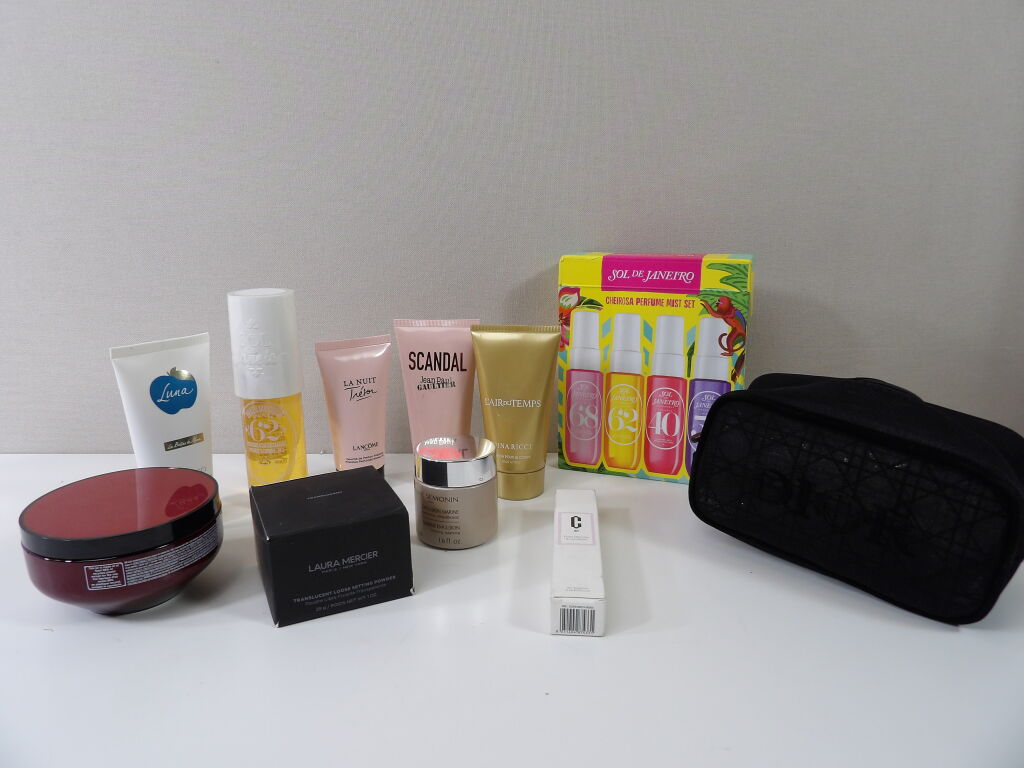 Lot de x10 COSMETIQUES (neuf et occasion) et une petite pochette make up DIOR : Sol de Janeiro, SCANDAL Jean paul Gaultier lotion, Douche de parfum La nuit trésor Lancome, Lotion NINA RICCI, masque protecteur de cheveux colorés ....
