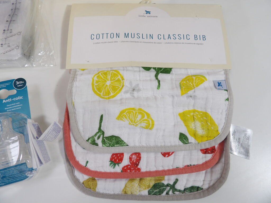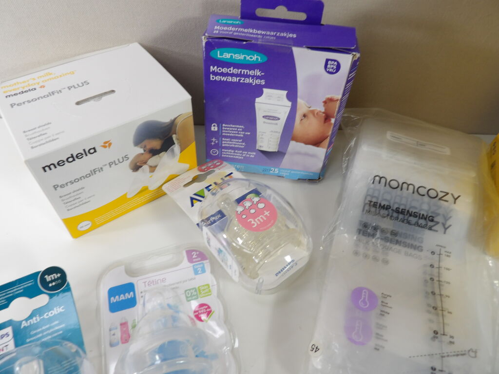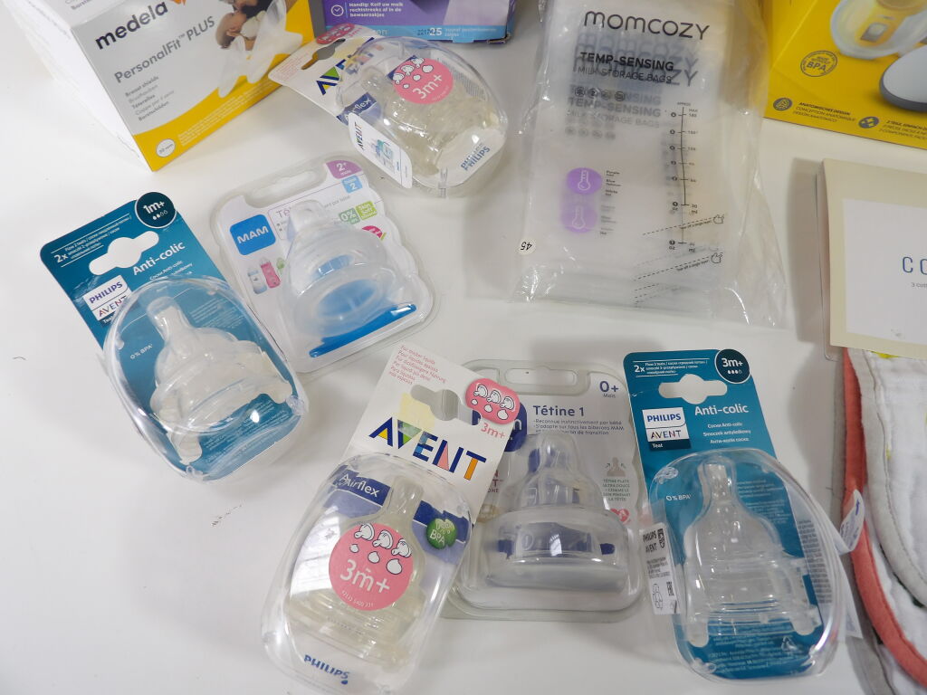 Lot de x11 articles dans le thème de l'ALLAITEMENT / tire lait (neufs et occasion): Medela tire lait électrique double (non testé), Momcozy sac conservation lait et Landisnoh, diverses tétines biberon x6 Philips et Mam, Medela Téterelles, et x3 bavoirs LITTLE UNICORN.