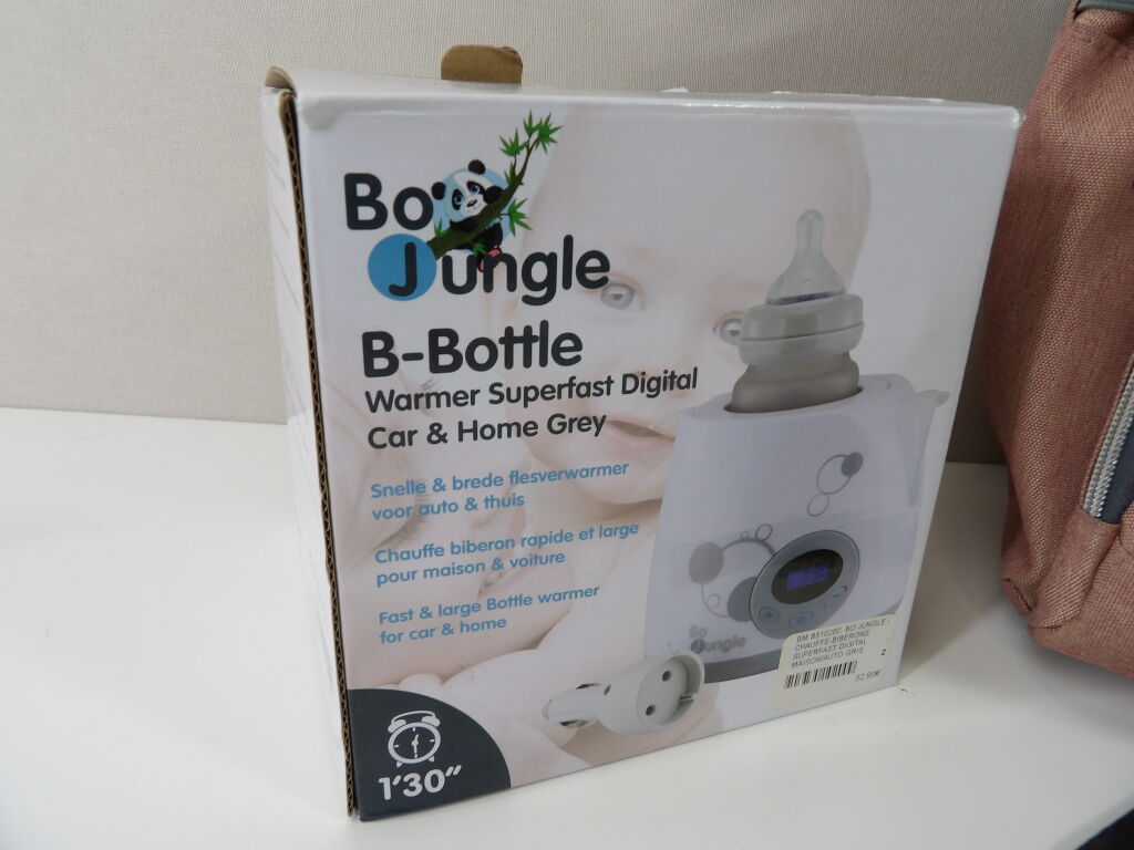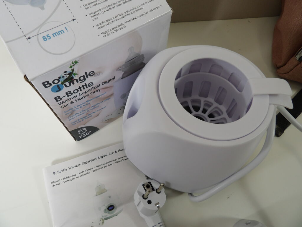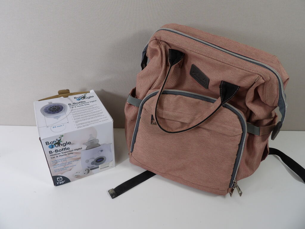 Lot de x2 accessoires pour le TRANSPORT : Chauffe biberon nomade (avec prise murale et prise cigare voiture) - etat neuf boite descellée (prix neuf 50€!) et Sac à dos rose (état satisfant) à langer.