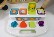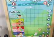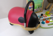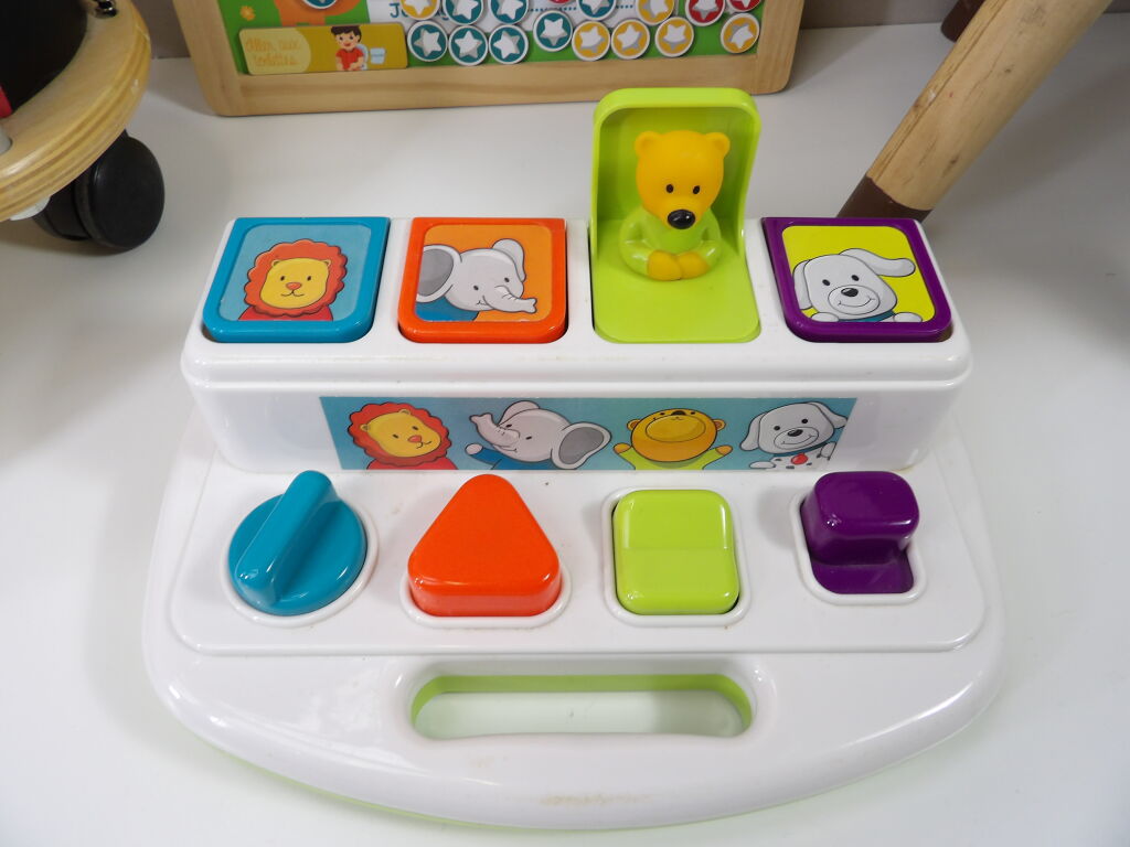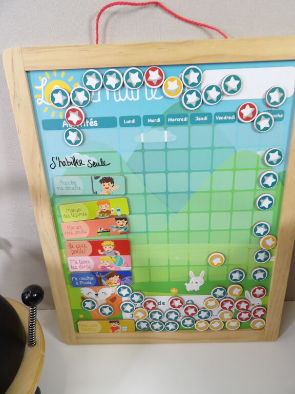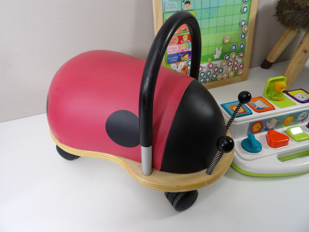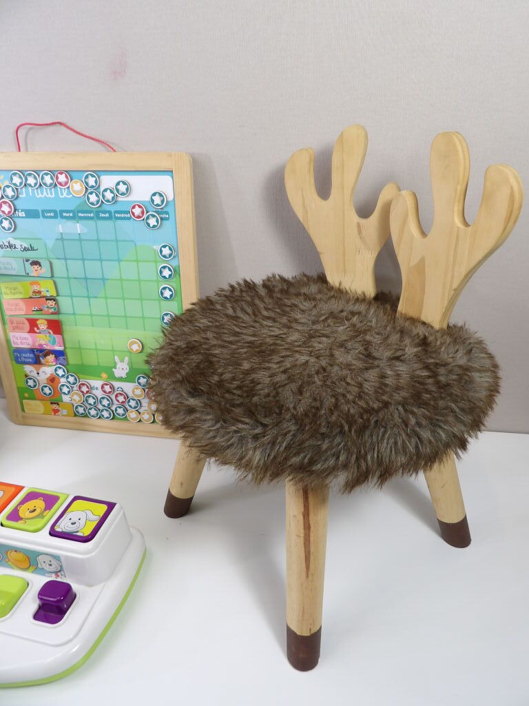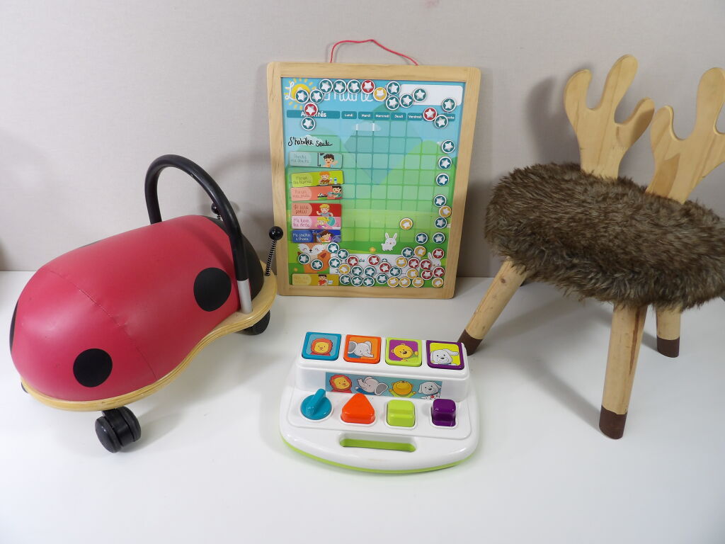 Lot de x4 accessoires d'occasion bon état, 6M-3A : Petite chaise fausse fourrure esprit élan, Trotteur / Porteur coccinelle (état neuf 79,99€!), Panneau inspiration Montessori pour aider les enfants dans leur routine, et petit jeu poussoir pop up.