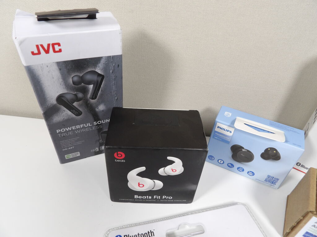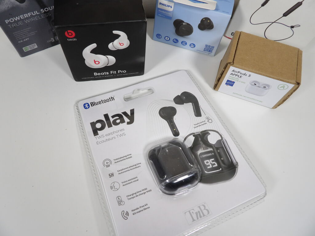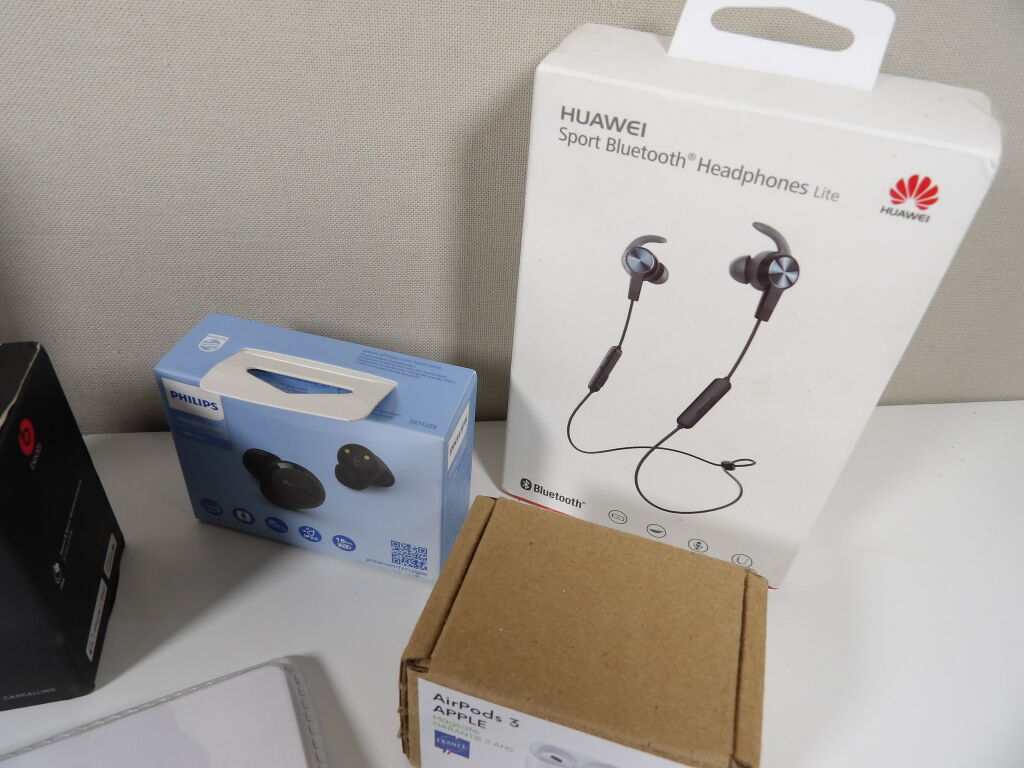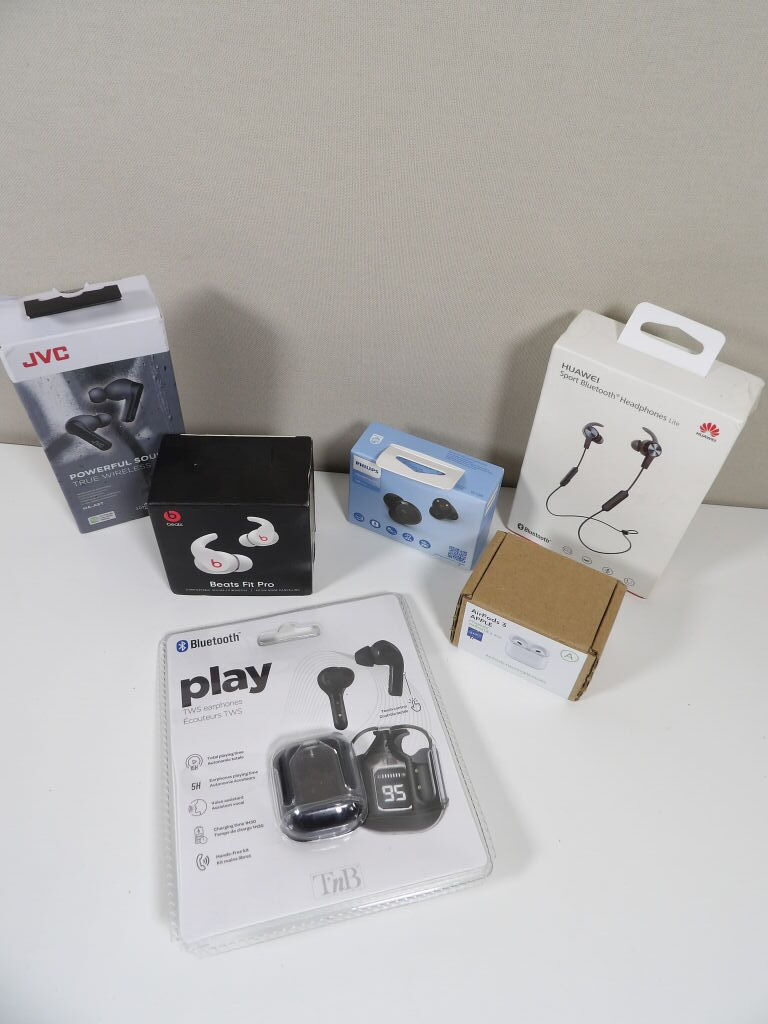 Lot de x6 écouteurs (neuf et occasion vendus en l'état) JVC, HUAWEI, Play.. et des airpods reconditionnés (3rd generation).