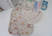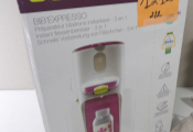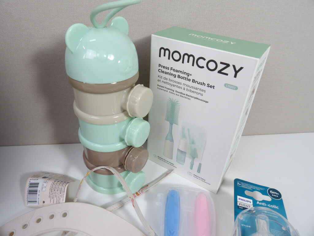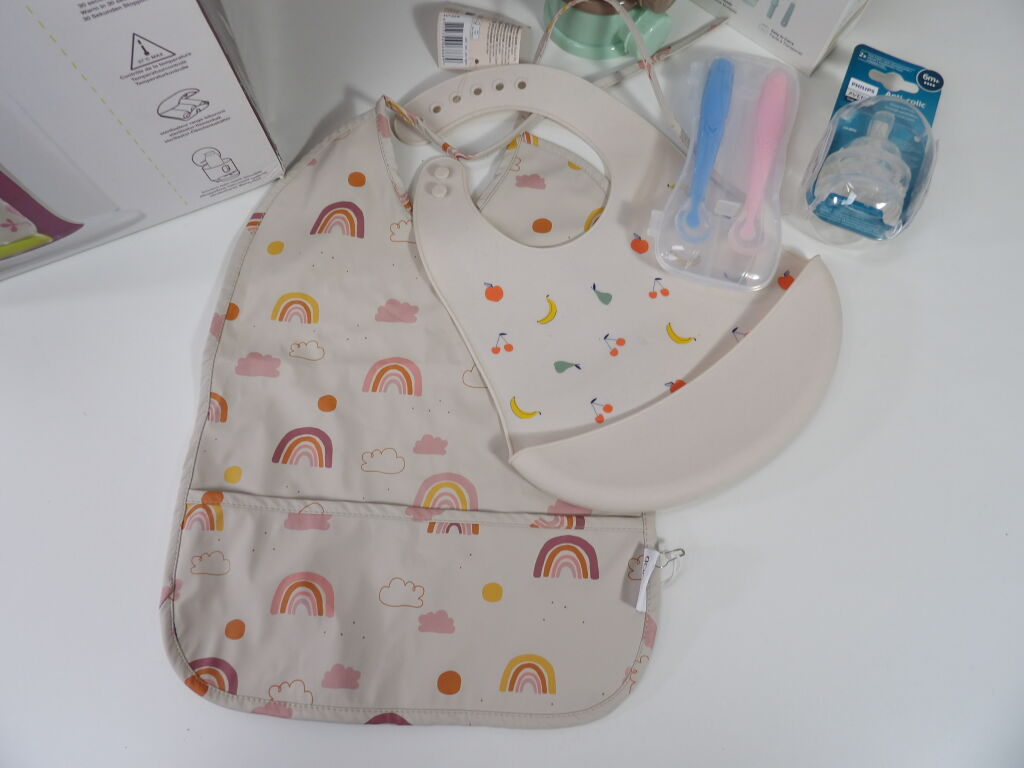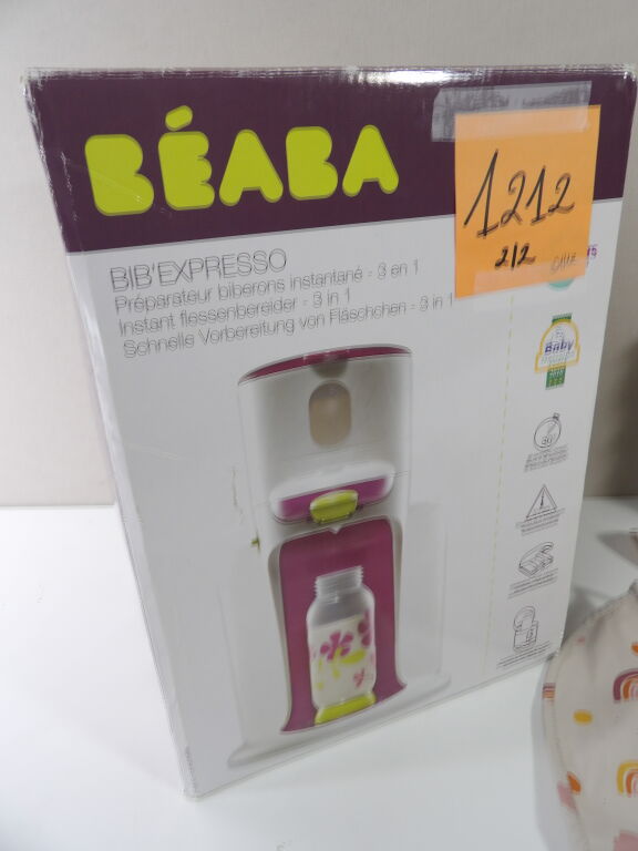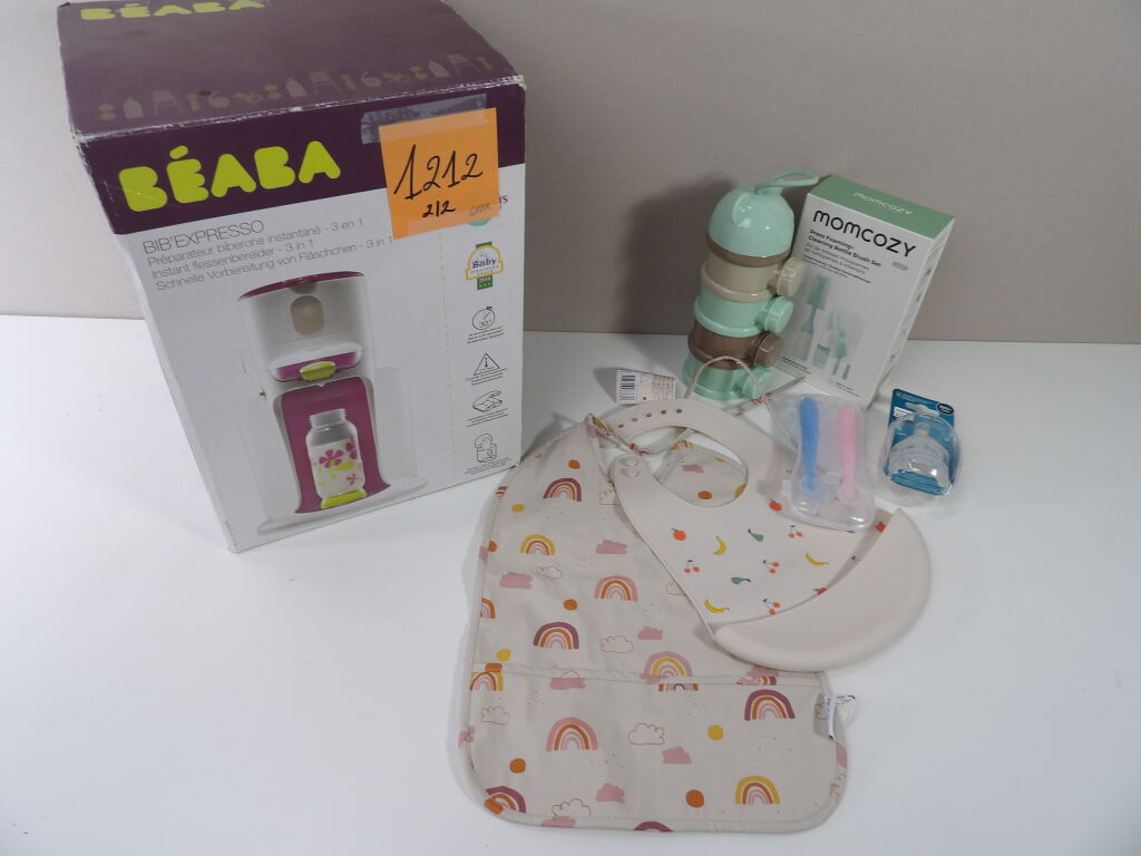 Lot de x7 articles dans le thème du BIBERON (neufs et occasion): Beaba Bib'expreso préparateur de biberons instantanté 3 en 1 d'occasion (non testé), Boite doseuse de lait, MOMCOZY Kit de brosses moussantes et nettoyantes à biberons, Tétines biberon Philips 6m+, x2 bavoirs Hoodadoo et Liewood, et on y inclut des petites cuillères en silicone.