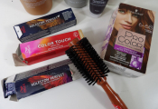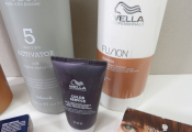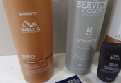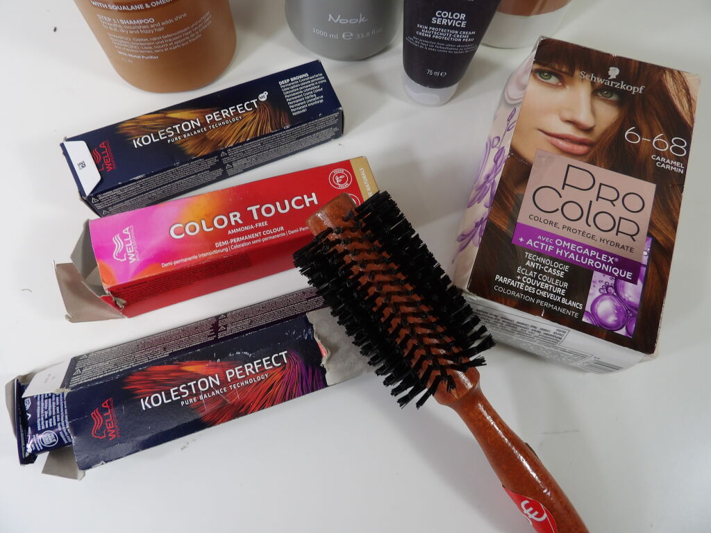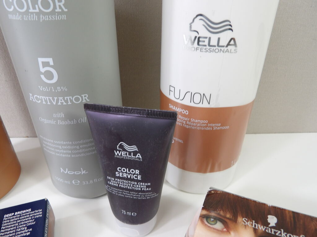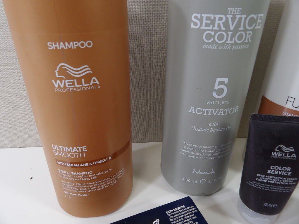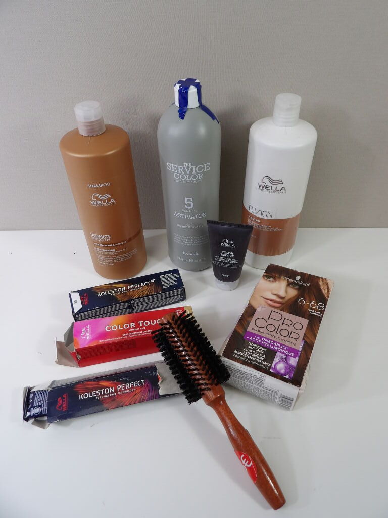 Lot de x8 COSMETIQUES (neuf et occasion) : x3 bidons de 1000ML WELLA Shampoing et THE SERVICE COLOR emulsion oxydante conditionnante, teintures cheveux et brosse à cheveux.