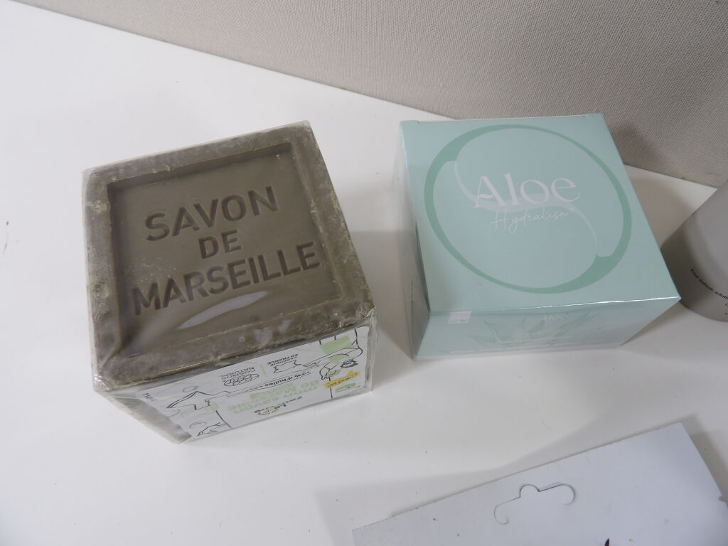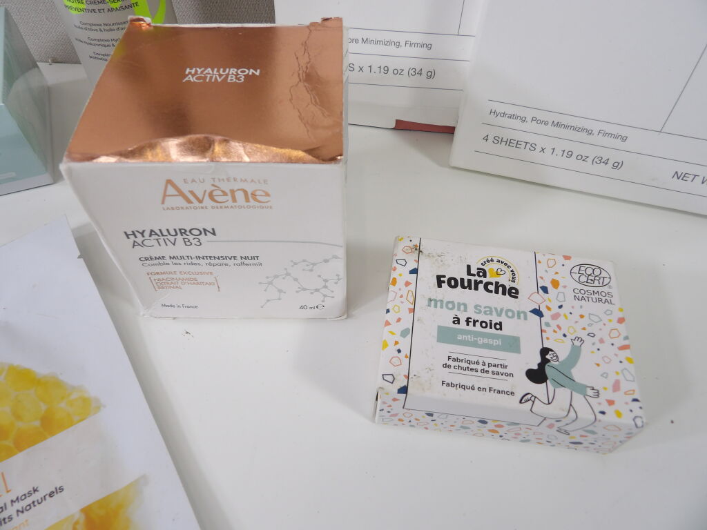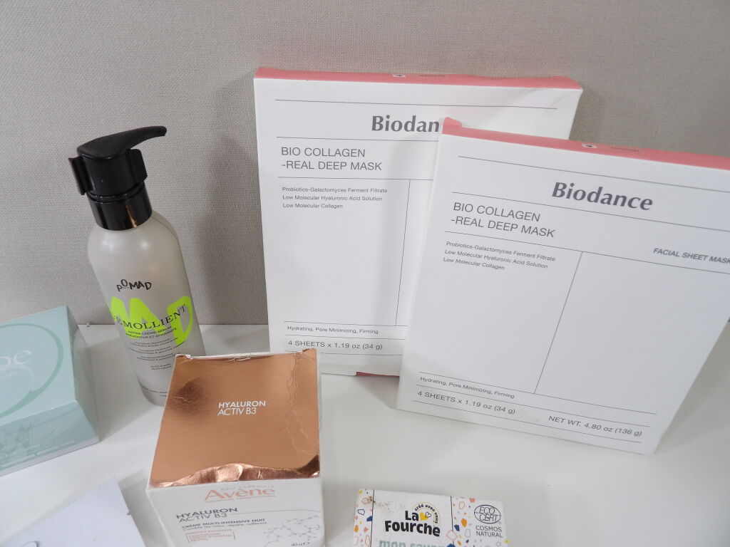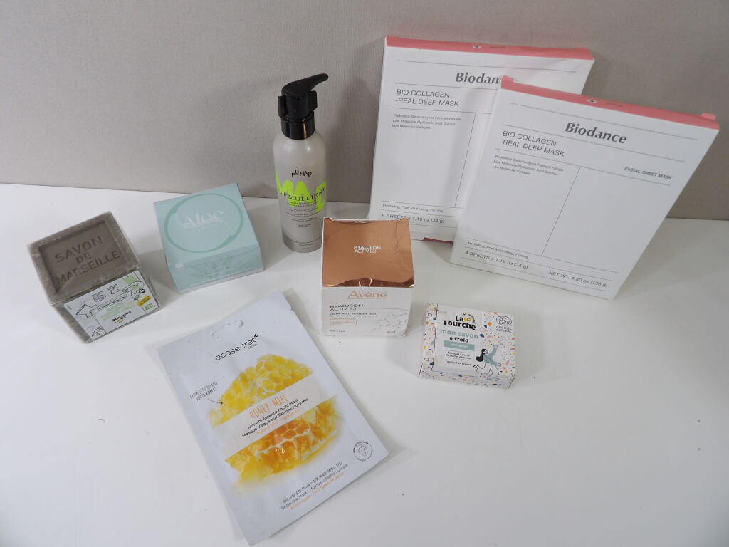 Lot de x8 SOINS et MASQUES (neuf et occasion) : Aloe anti cernes, Avene HYALURON ACTIV B3 crème multi-intensive nuit, Crème et sérum POMAD, Savons solides, et x2 Masques BIODANCE au bio collagen. On y inclut un autre masque.