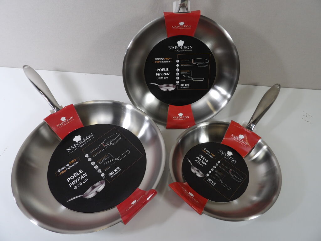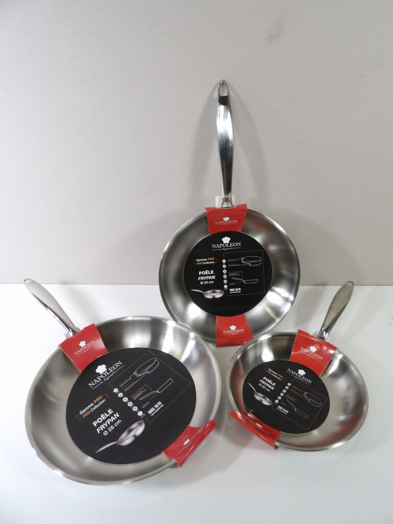 NAPOLEON Imperial - Set de 3 poêles NEUVES modèle FRYPAN, en INOX 18/10 (induction OK), diamètres 20 / 24 et 28CM. Gamme PRO.