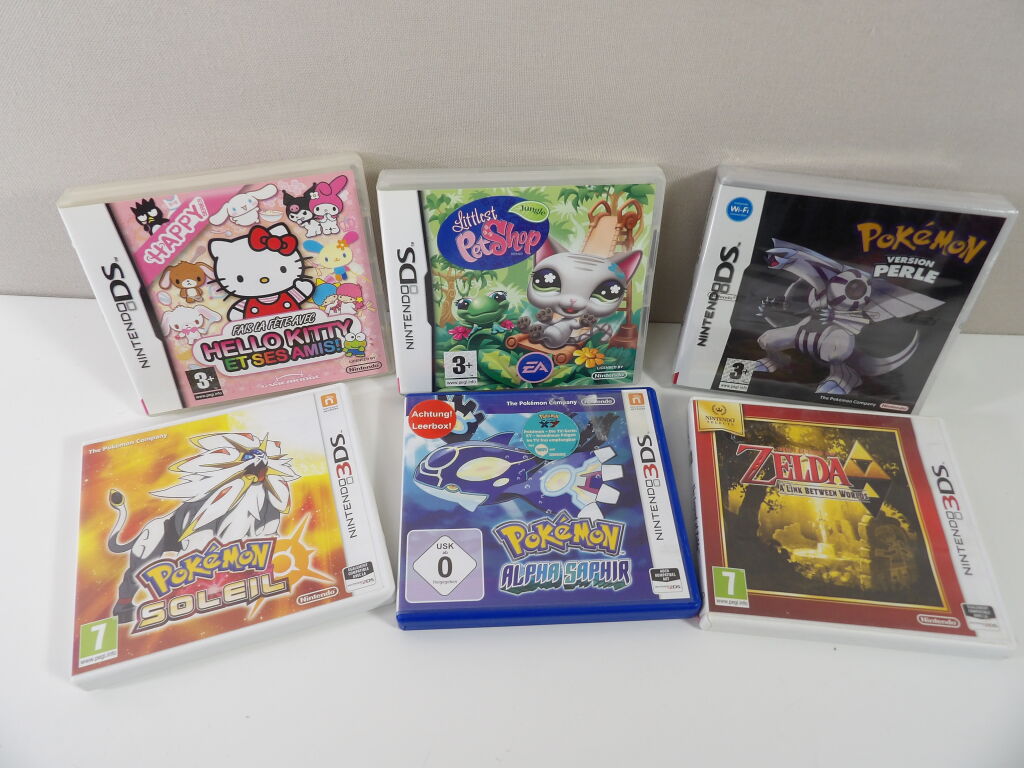 NINTENDO 3DS : Lot de x6 jeux d'occasion et neuf : POKEMON Version Perle (neuf), Hello Kitty et ses amis, Littlest Pet Shop, Pokemon Soleil, Pokemon Alpha Saphir, et ZELDA.