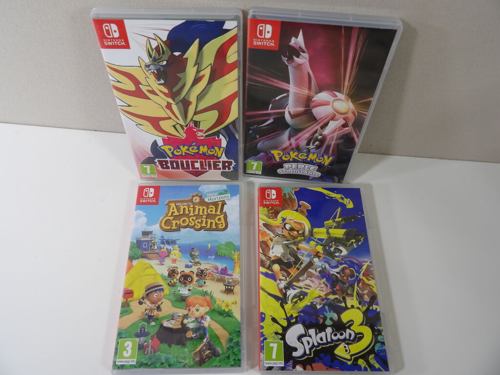 NINTENDO SWITCH : Lot de x4 jeux d'occasion: ANIMAL CROSSING, SPLATOON 3, POKEMON Perle scintillante et POKEMON Bouclier.