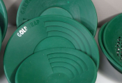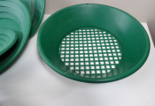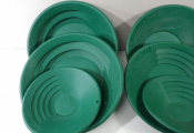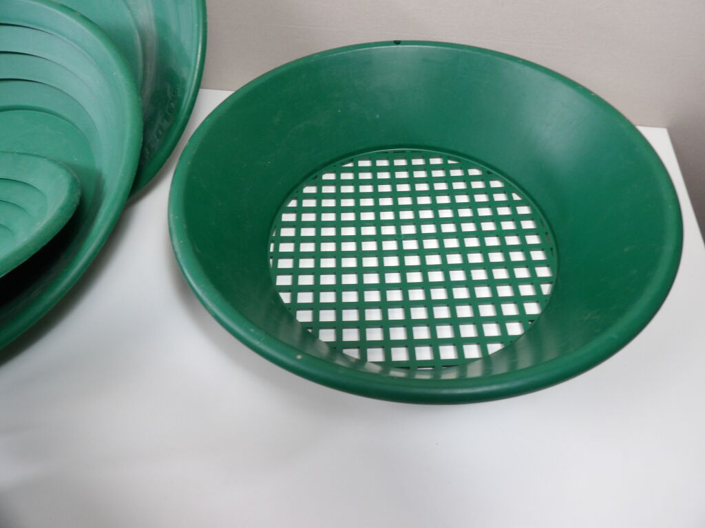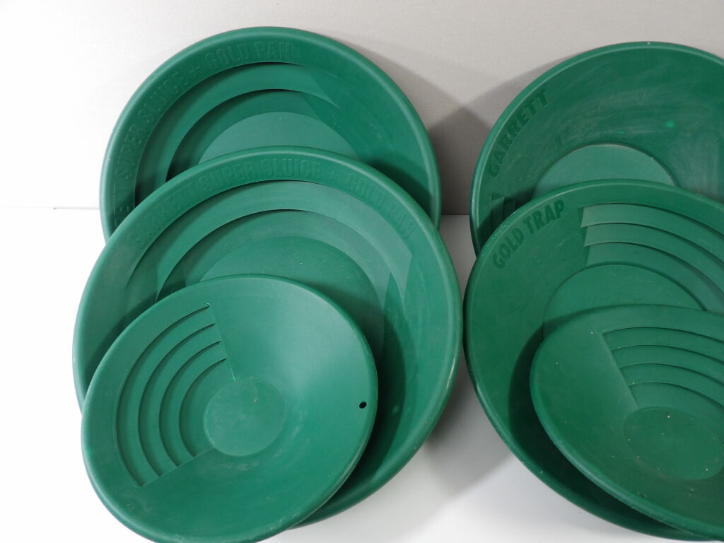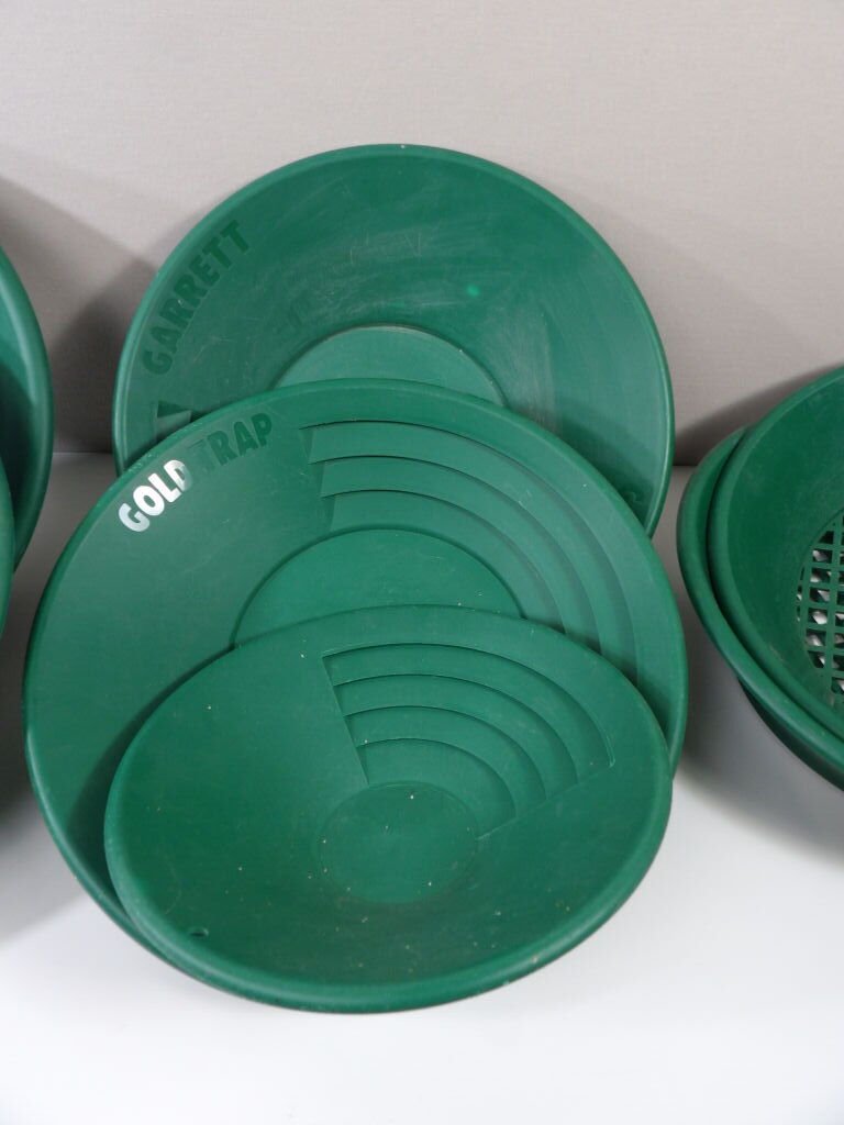 Orpaillage : lot de 6 batées (pans) de différents diamètres et 2 tamis de marque Garrett, occasion bon état, rayures.