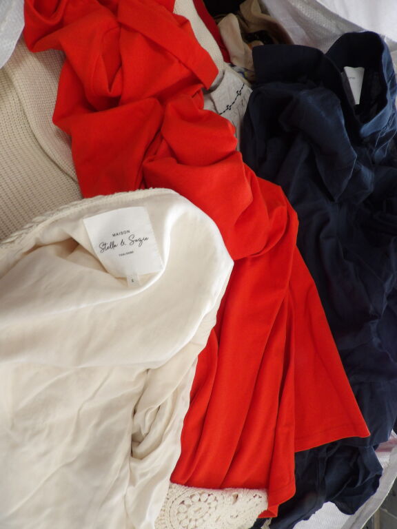 Palette de 200 pièces de vêtements d'occasion et certains neufs : Femme, Enfant, Homme ( divers gammes et marques dont Ba&sh,The Kooples, Sézane...) - ATTENTION ce lot est d'occasion tous états et contient divers gammes donc de l'entrée type KIABI aussi. il n'est pas composé uniquement des marques citées.