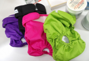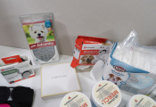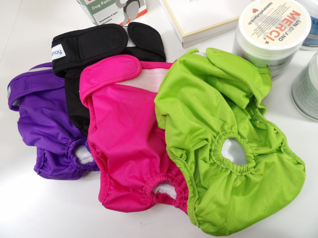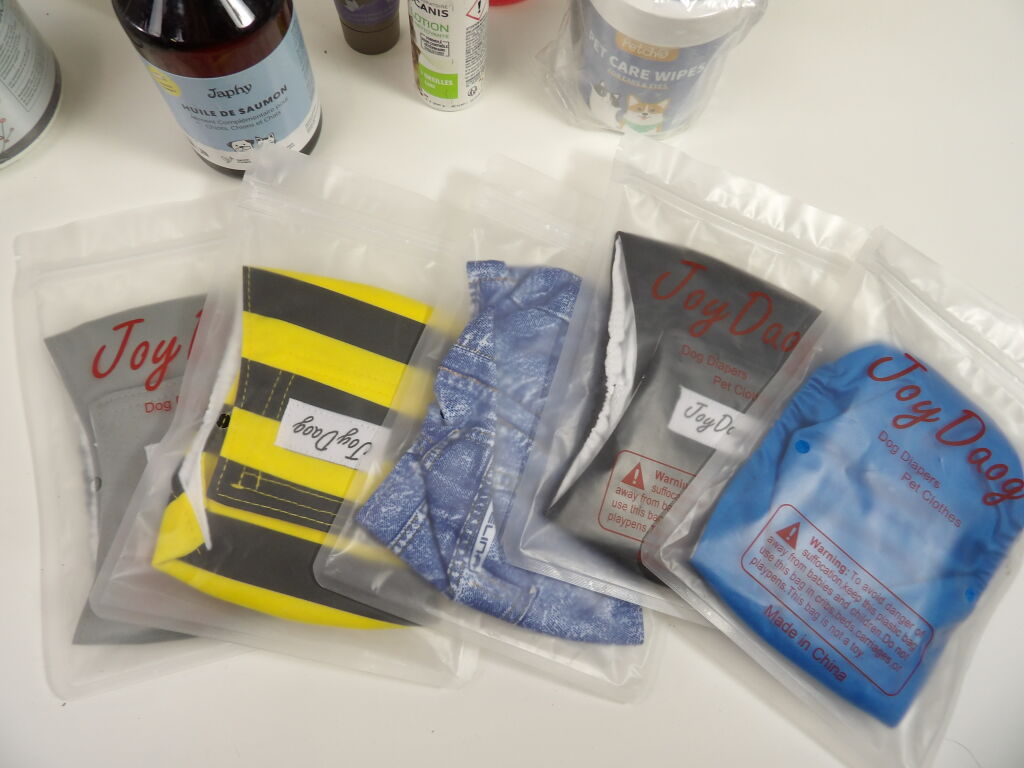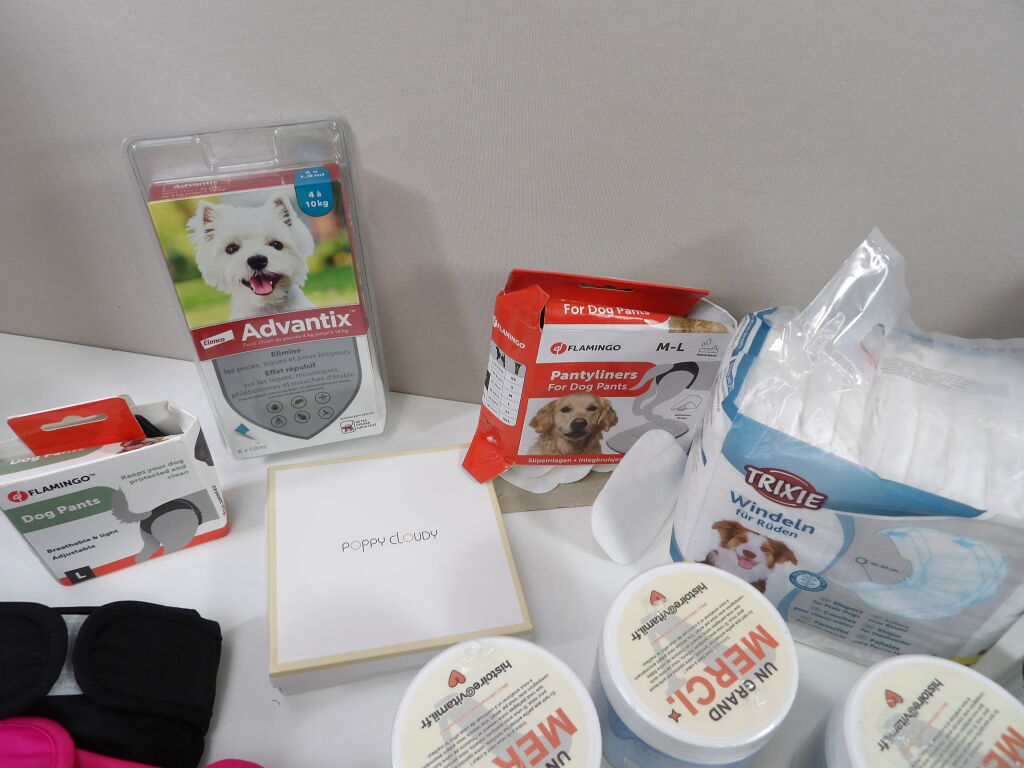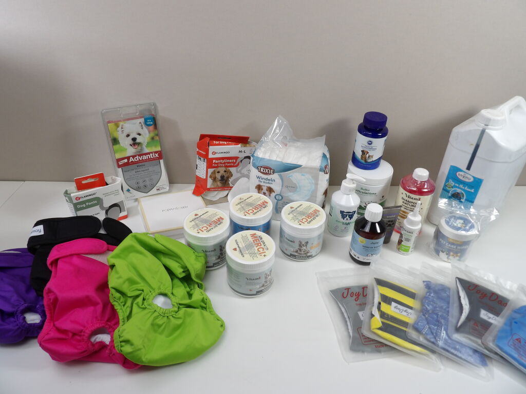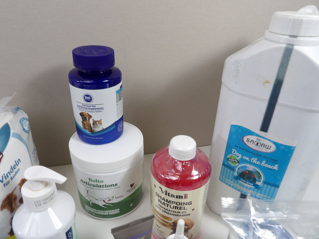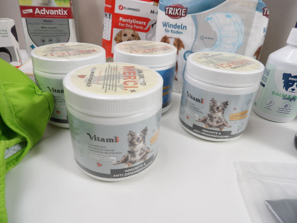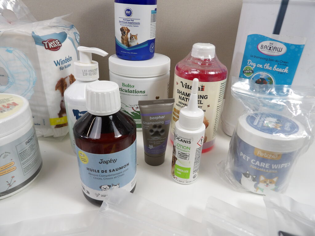 SOINS pour CHIENS : Lot d'une vingtaine d'articles divers (neuf et occasion) : Shampoings, Advantix (anti puces, tiques et poux broyeurs) 6x 1ML, x9 Couches lavables dont Joy Daog, et autres couches, huile bien être, oreilles...