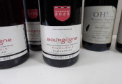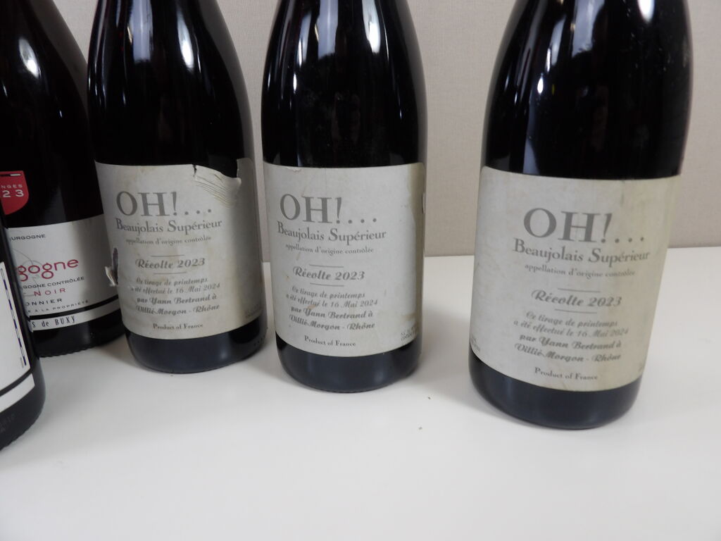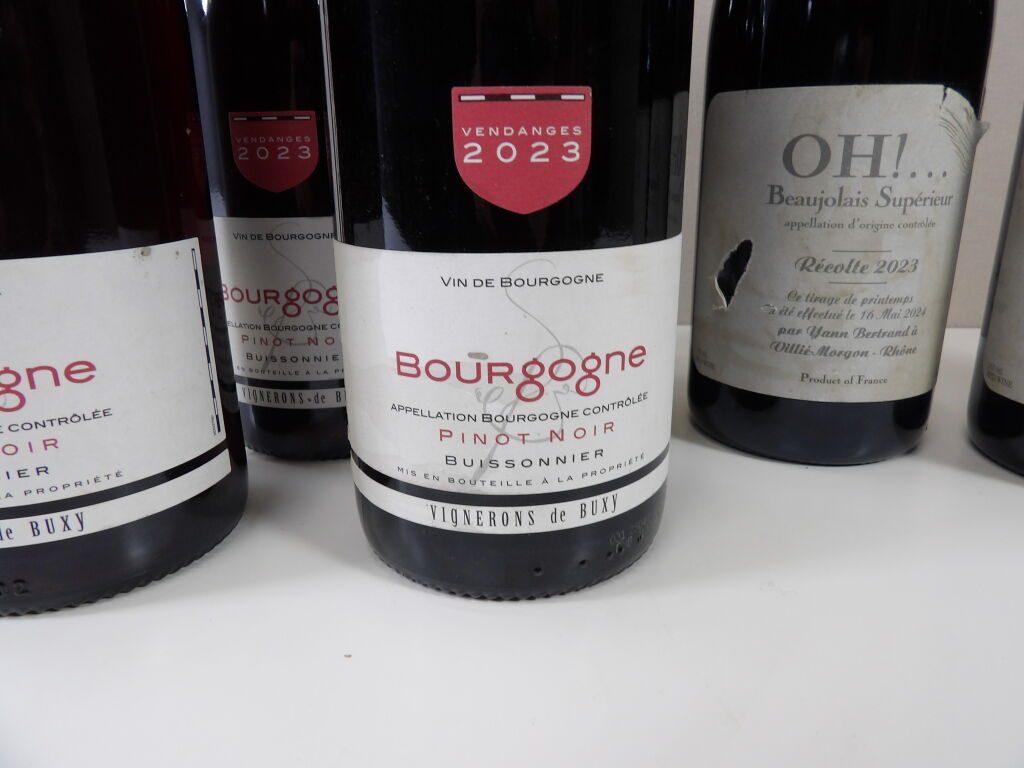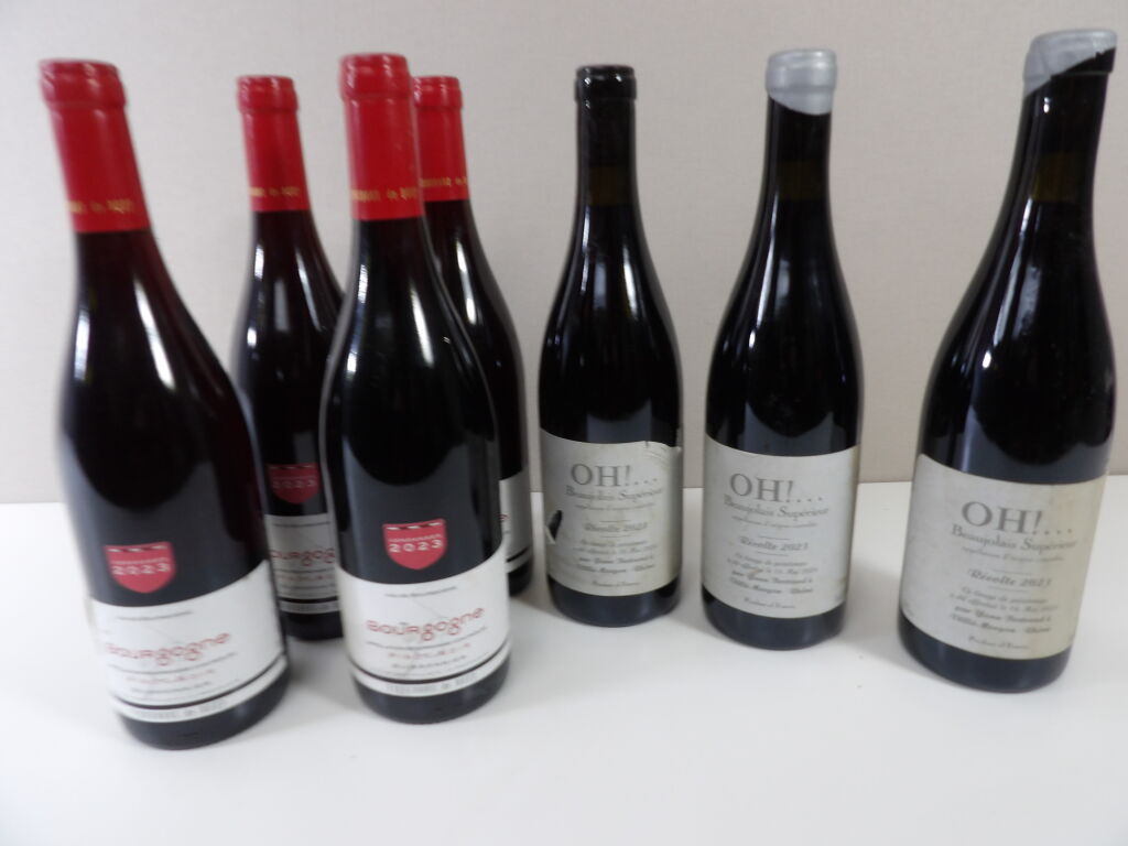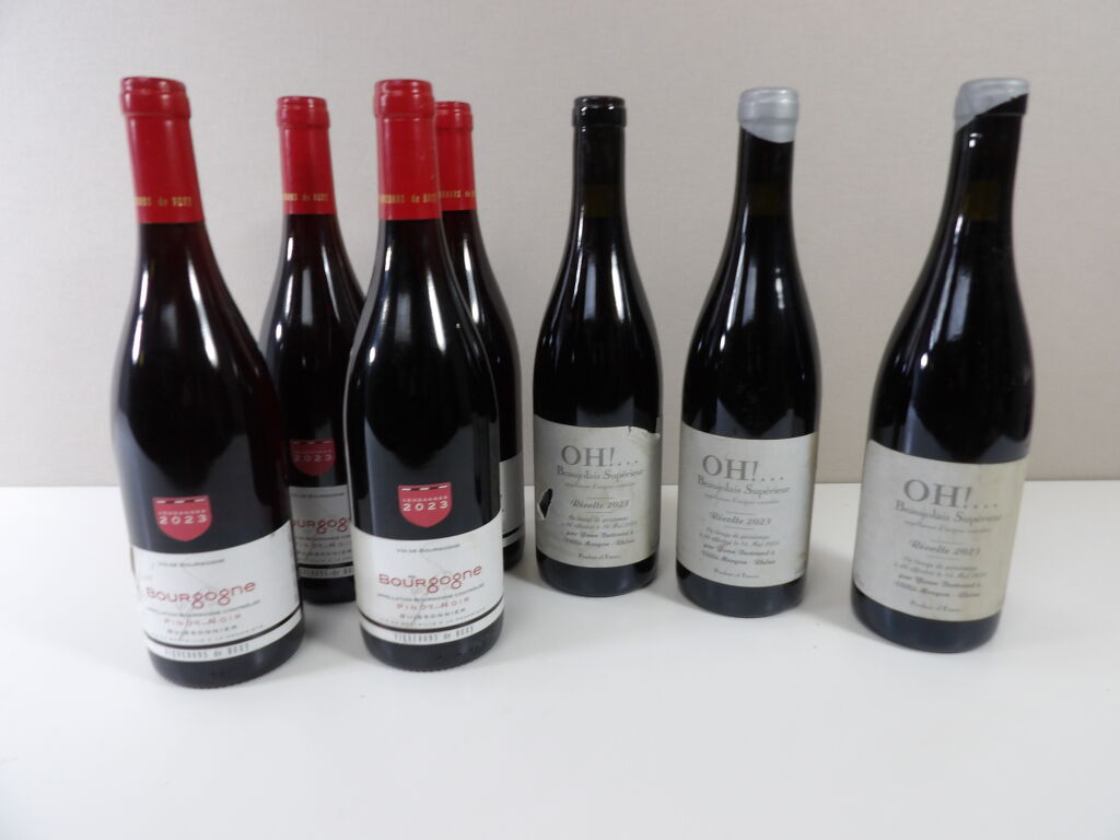 Vin rouge : 7 bouteilles dont 3 de beaujolais supérieur Yann Bertrand récolte 2023 et 4 de Bourgogne en pinot noir maison Buissonnier récolte 2023.