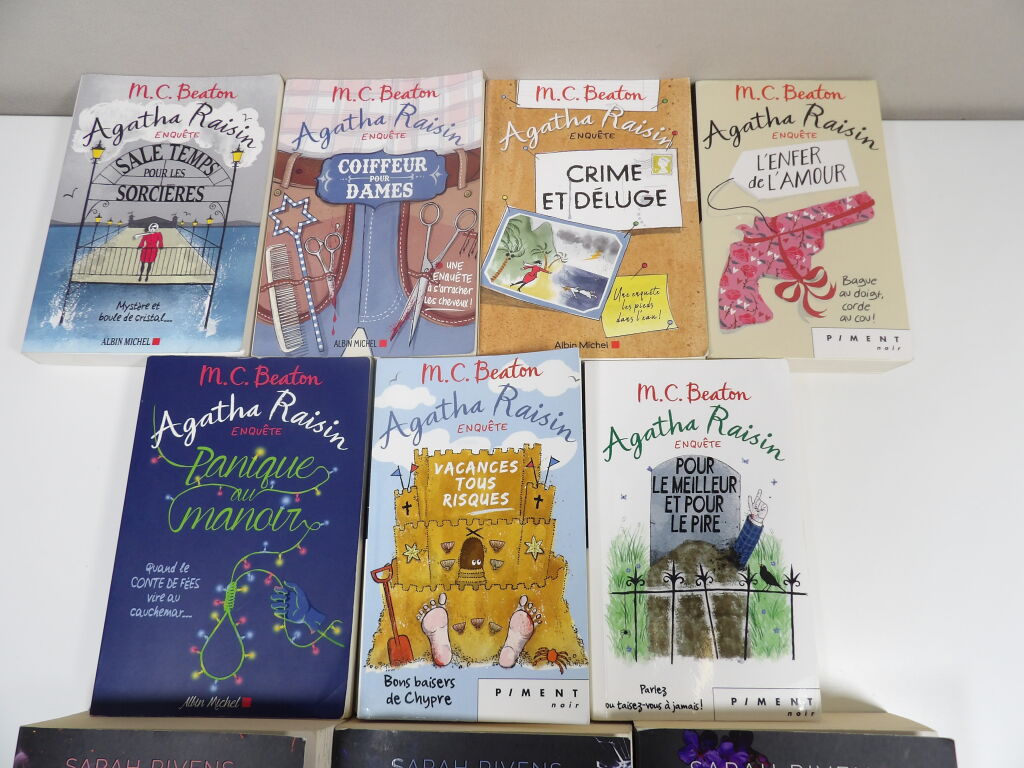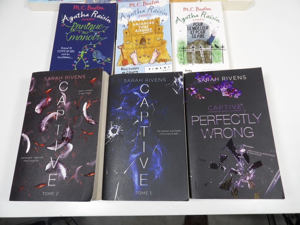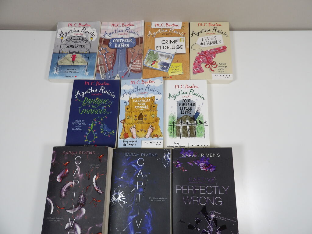 10 livres dont Les enquêtes d'Agatha Raisin par M. C. Beaton 7 livres, occasion, éditions Piment noir et Albin Michel, on y joint Captive de Sarah Rivens, éditions BMR tomes 1 et deux et Captive Perfectly wrong tome 1,5, occasion.