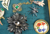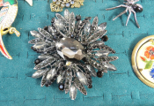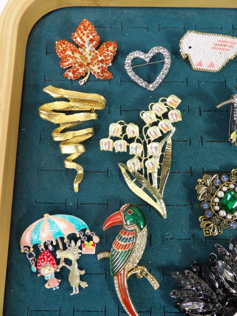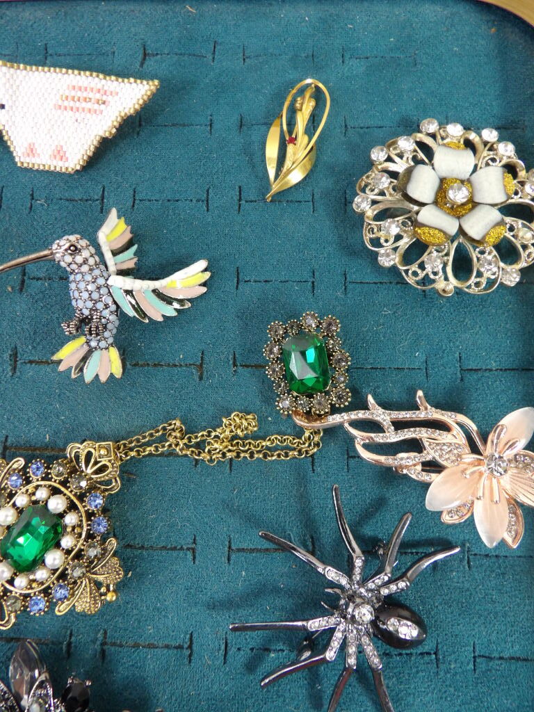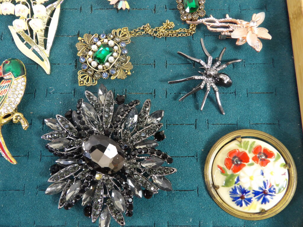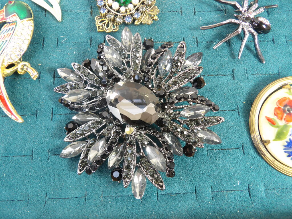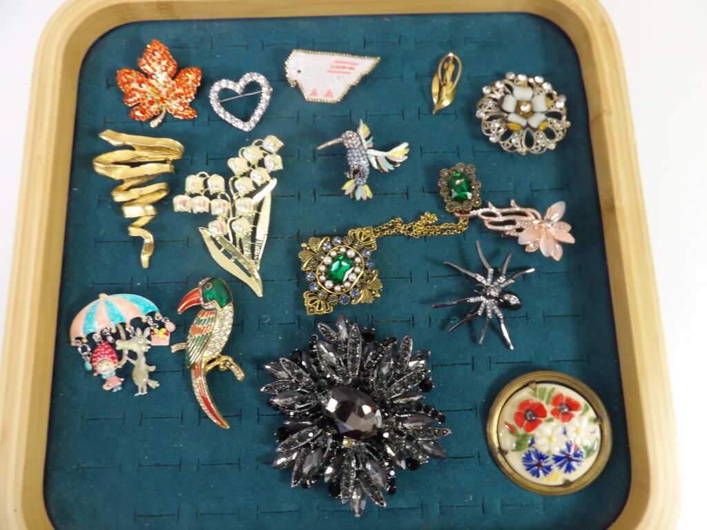 15 broches fantaisie d'occasion (dont une attribuée à Edouard Rambaud Paris en métal doré) un strass manquant sur la grosse broche noire.