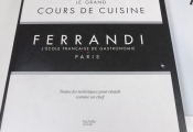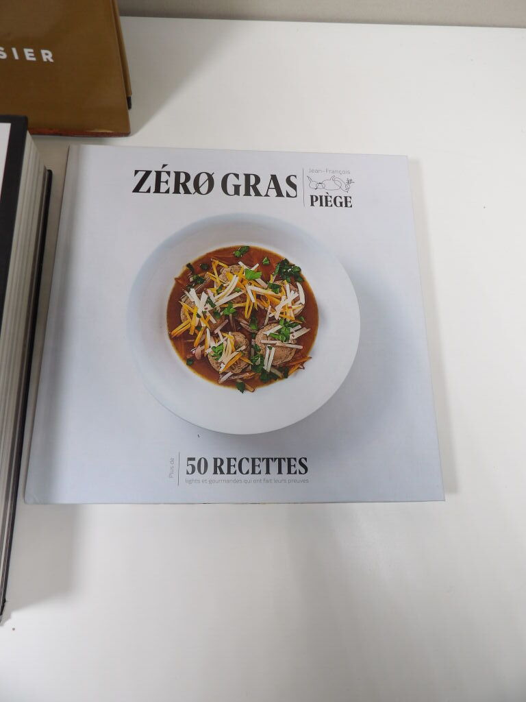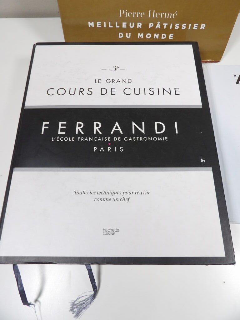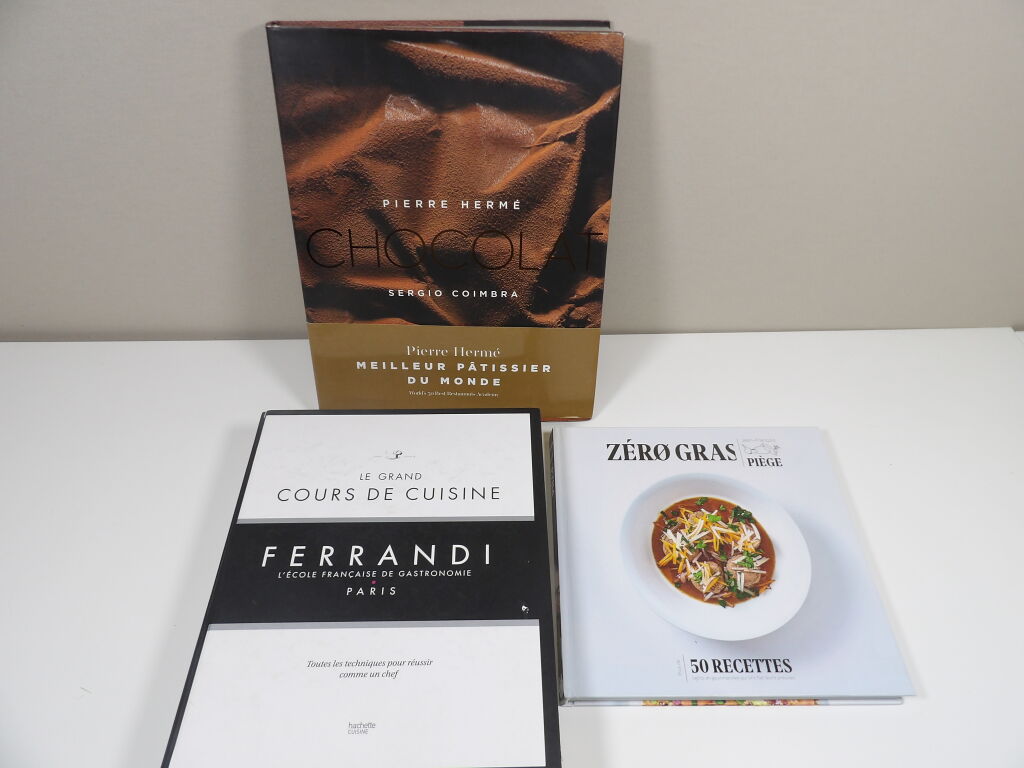 3 livres : Jean-François Piège Zéro gras plus de 50 recettes édition hachette, Le grand cours de cuisine Ferrandi hachette cuisine (coins abîmés traces sur la couvertutre) et Chocolat par Pierre Hermé et Sergio Coimba chez Flammarion (jaquette abîmée).