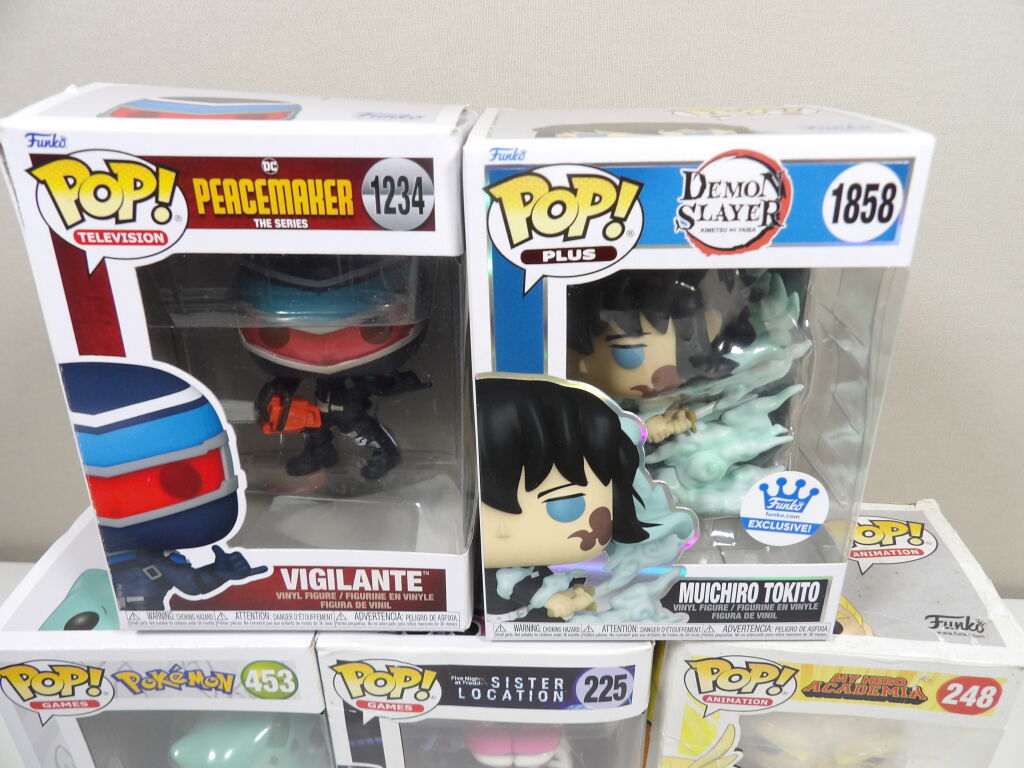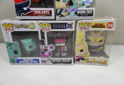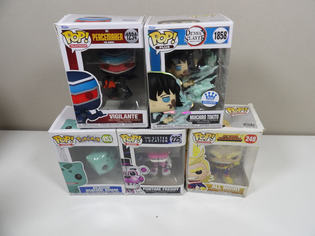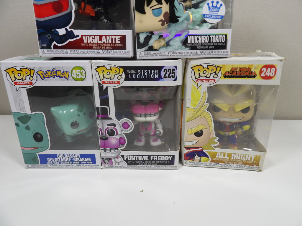 5 figurines Pop de différents univers, boîtes abîmées.