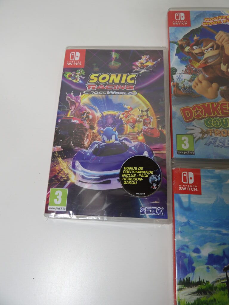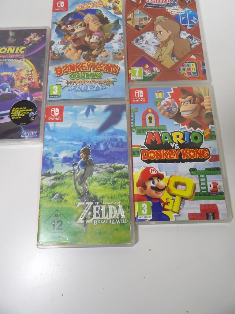 5 jeux pour Nintendo Switch dont Mario vs Donkey Kong, Zelda ... ---occasion non testé vendu en l'état--- et Sonic racing crossworlds beuf sous blister.