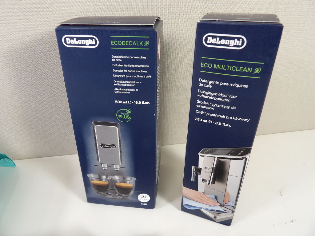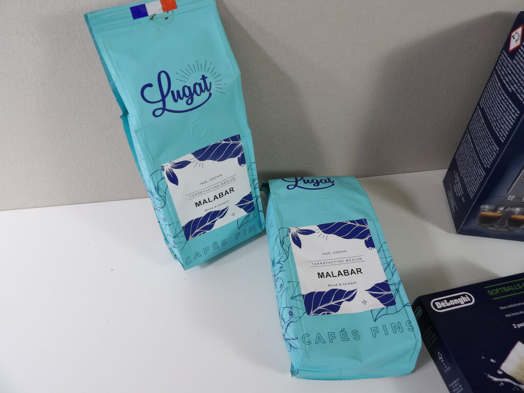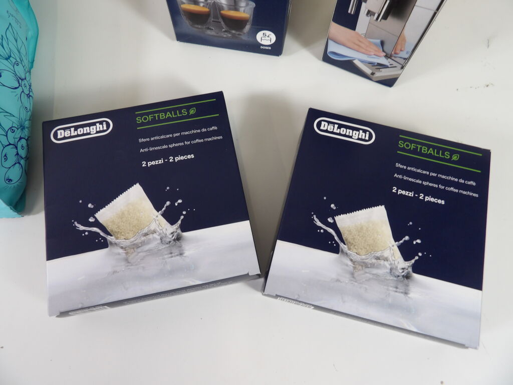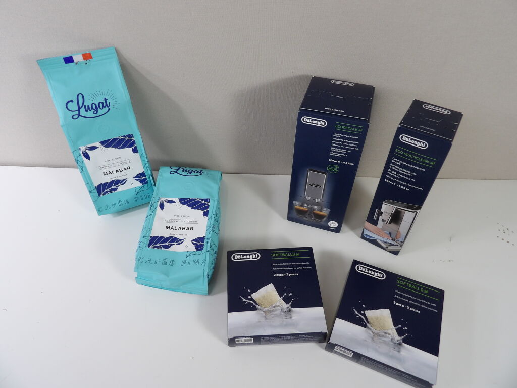 CAFÉ ! NEUF ! DéLonghi Détartrant pour machine à café 500ML, x2 de 2 Sphères anticalcaires Softballs, et Détergent de machine à café 50ML. On y inclut x2 cafés en grains de 250g - LUGAT Torréfaction medium Malabar.