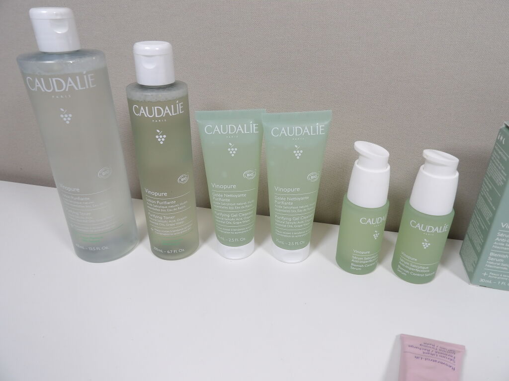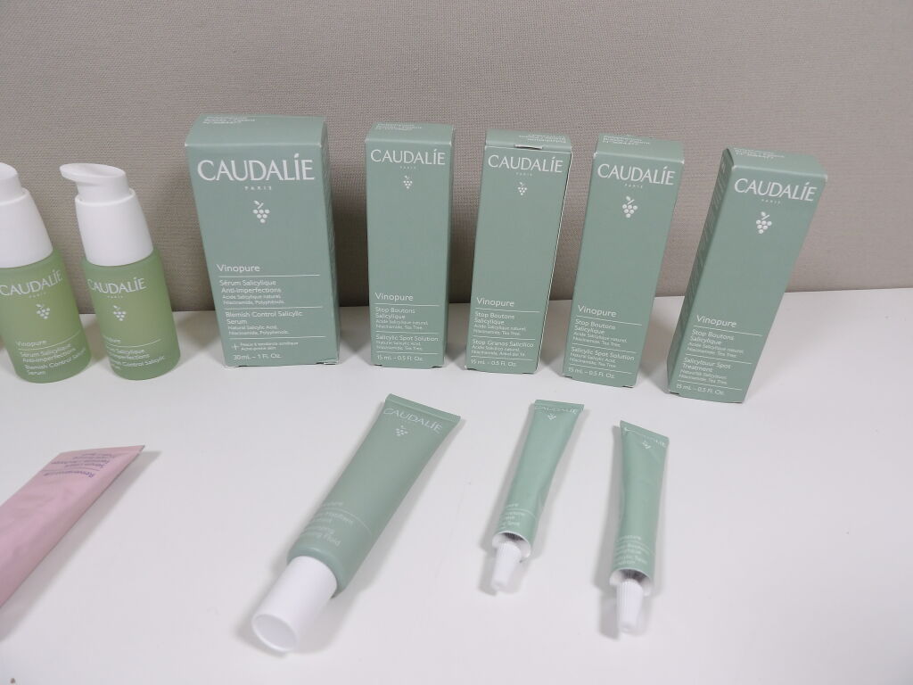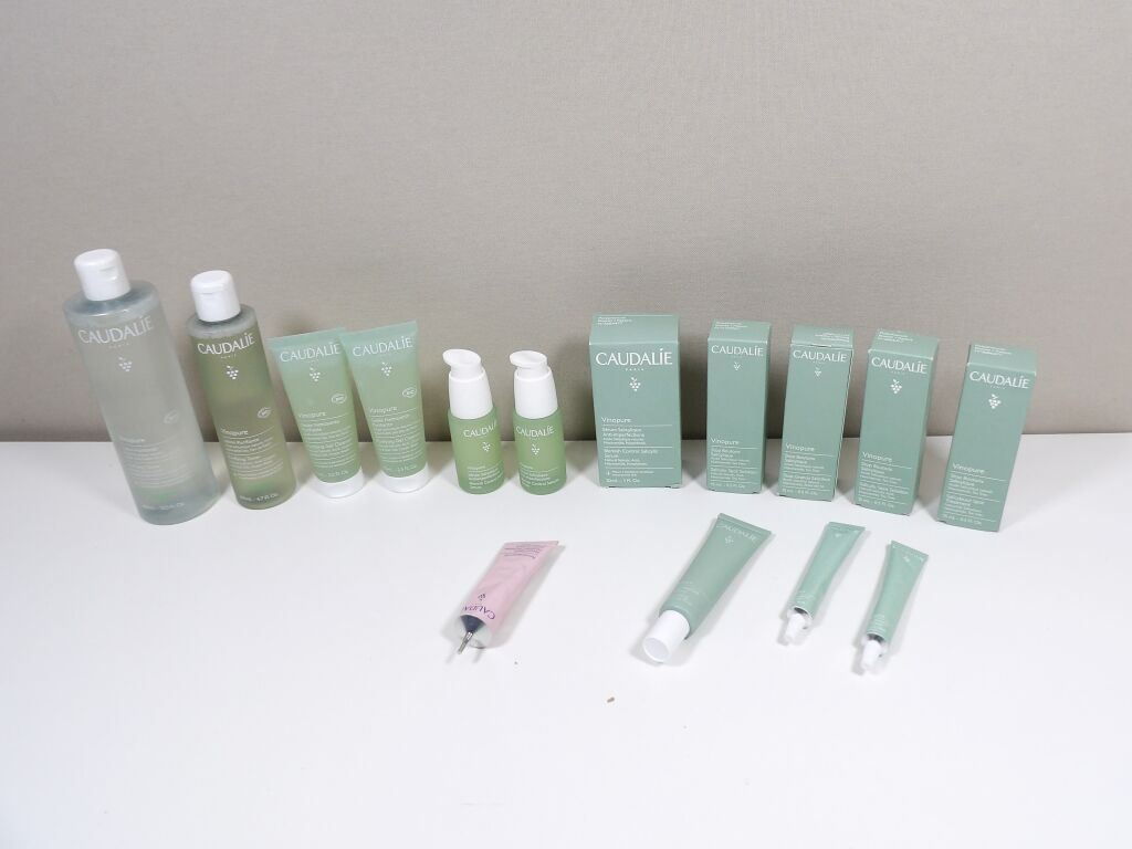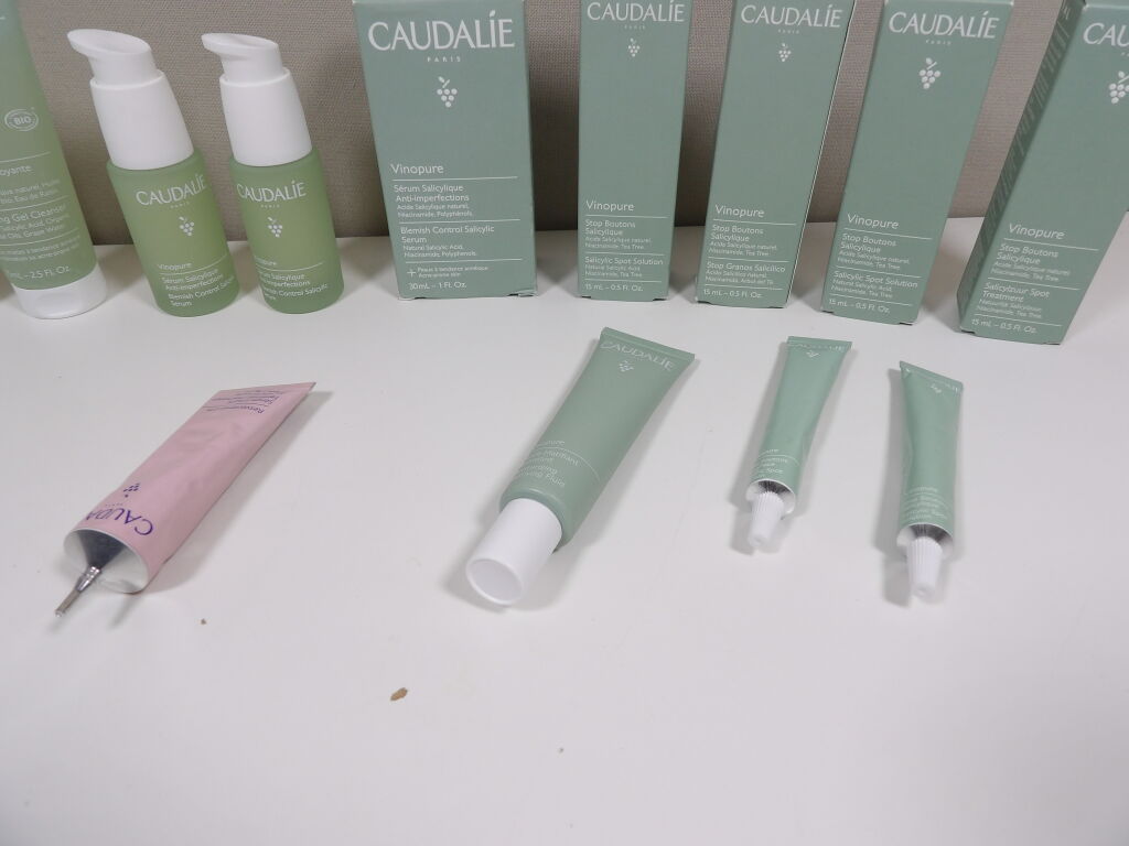 CAUDALIE - Gamme Vinopure - Lot de 15 articles Neufs: 2x Gelée Nettoyante Purifiante 75ml - 1x lotion Purifiante 400ml + 200ml - 3x Sérum salicylique 30ml - 6x Stop boutons salicylique 15ml - 1x fluide matifiant hydratant 40ml - 1x sérum liftant (recharge sans bouchon) 30ml