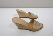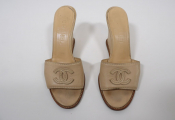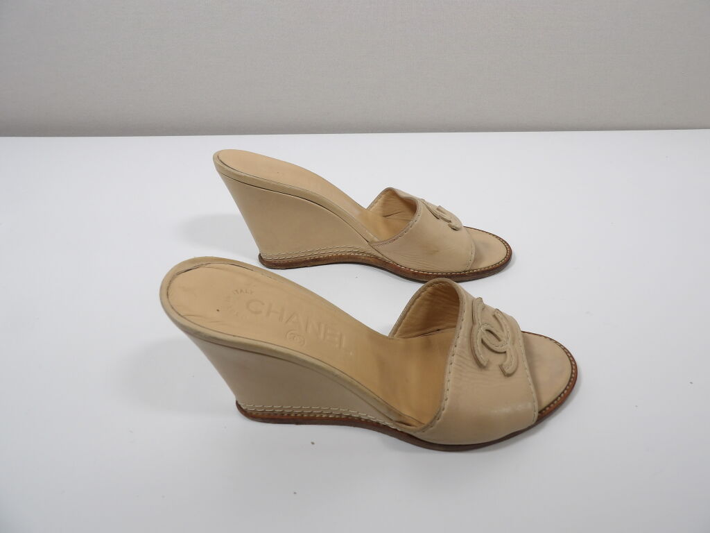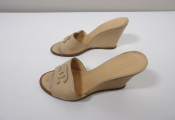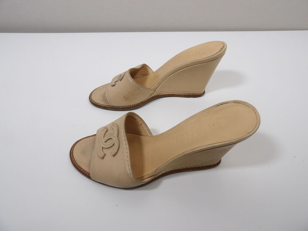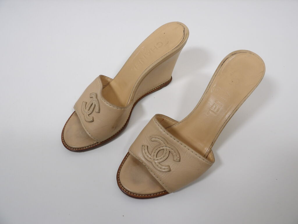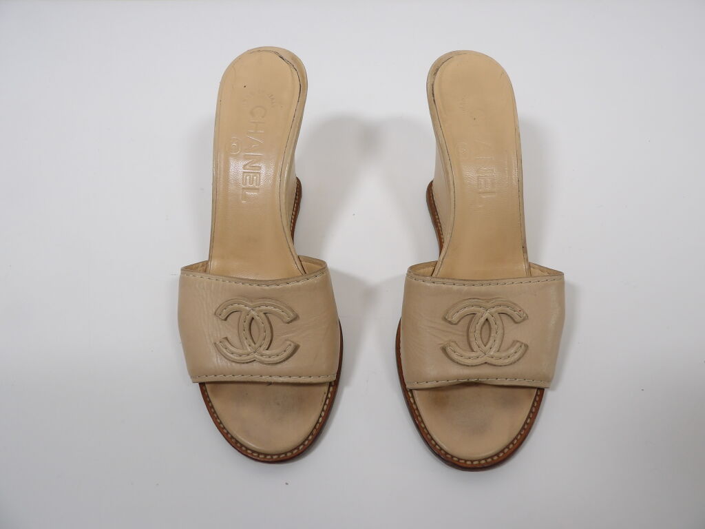 CHANEL - Paire de mules à talon vintage cuir beige - Taille 35 1/2 - Occasion état d'usage, prévoir ressemelage - Hauteur 8 cm