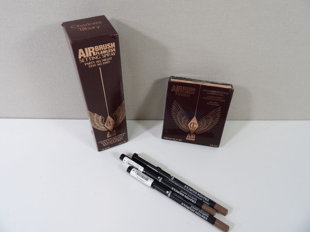 CHARLOTTE TILBURY Lot de x2 articles neufs (mais descellés): Fixateur maquillage 100ML et Micropoudre perfectrice de teint 8G. On y inclut x3 crayons a sourcils AVRIL marron N°202.