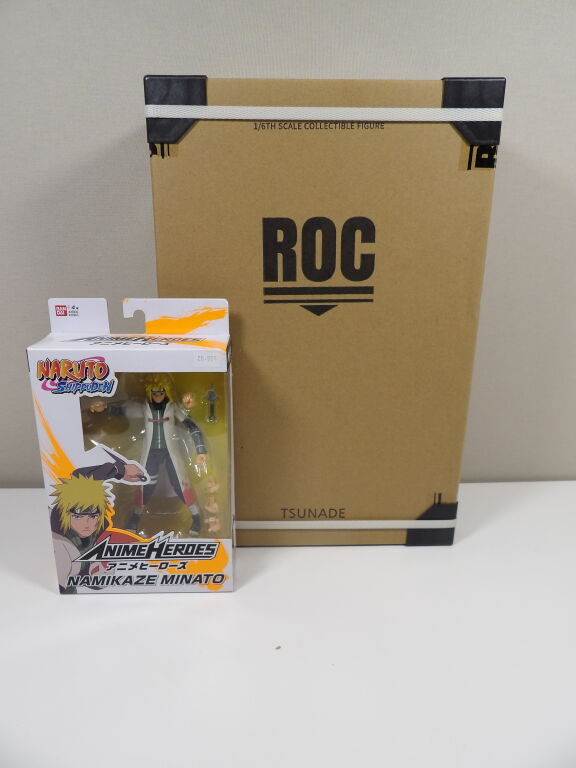 Figurines Naruto dont une de Tsunade échelle 1:6 scellée dans son emballage d'origine (image d'illustration du produit) Roc-009 et une figurine Bandai de Namikaze Minato.