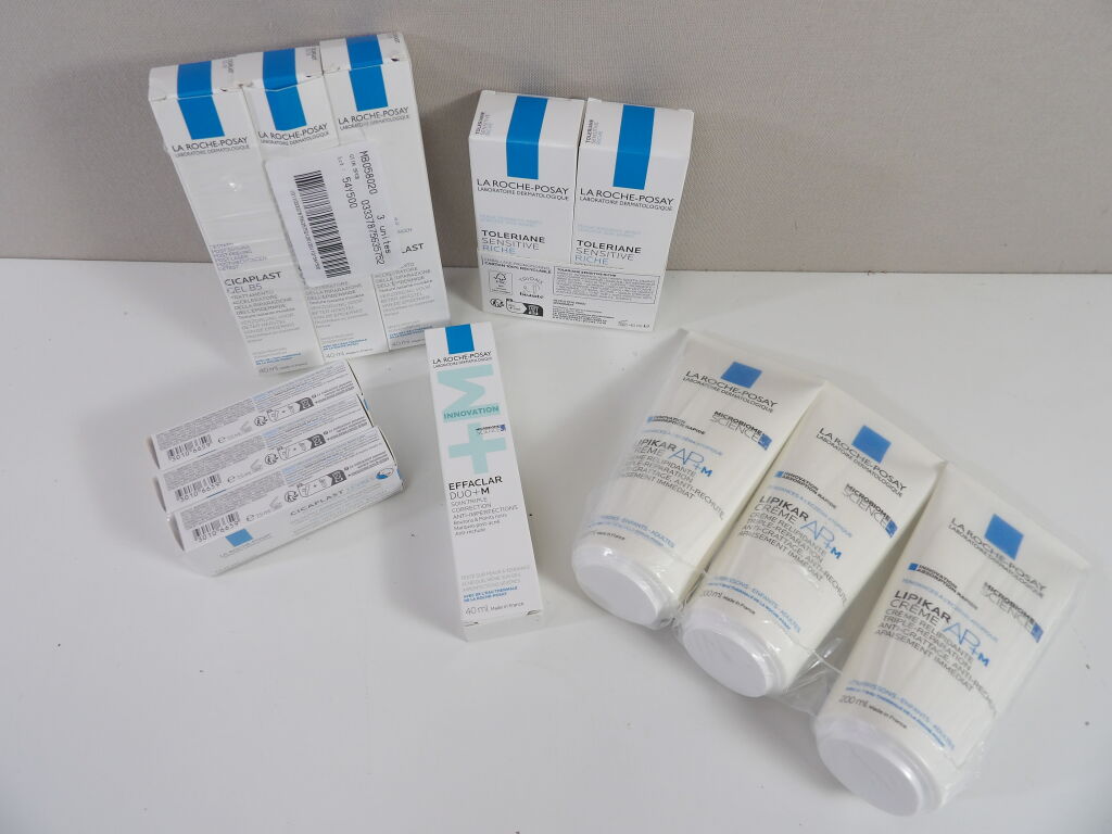 LA ROCHE-POSAY Lot de x12 articles NEUFS : x3 Cicaplat Gel B5, x3 Cicaplast Lèvres, x3 LIPIKAR Crème, x1 Effaclar DUO+M, x2 Toleriane Sensitive Riche.
