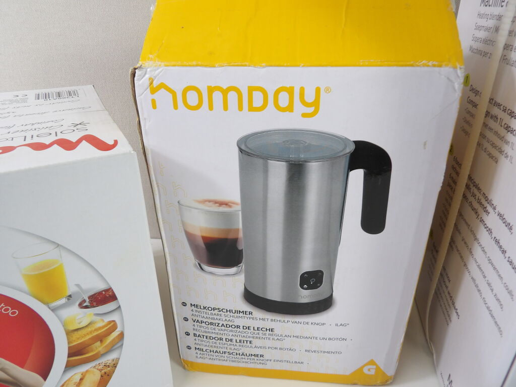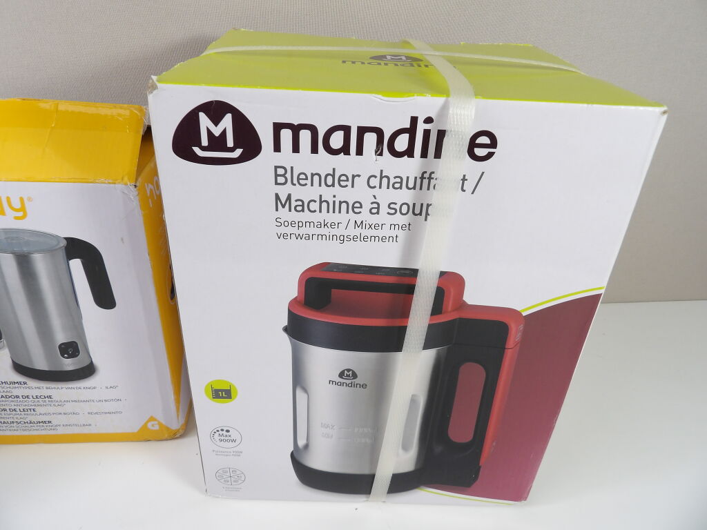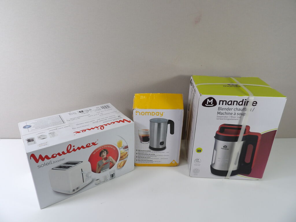 Lot de x3 petits électroménagers neufs et occasion : Mandine Machine à soupe, Moulinex grille pain soleil toaster, et Homday Mousseur à lait.