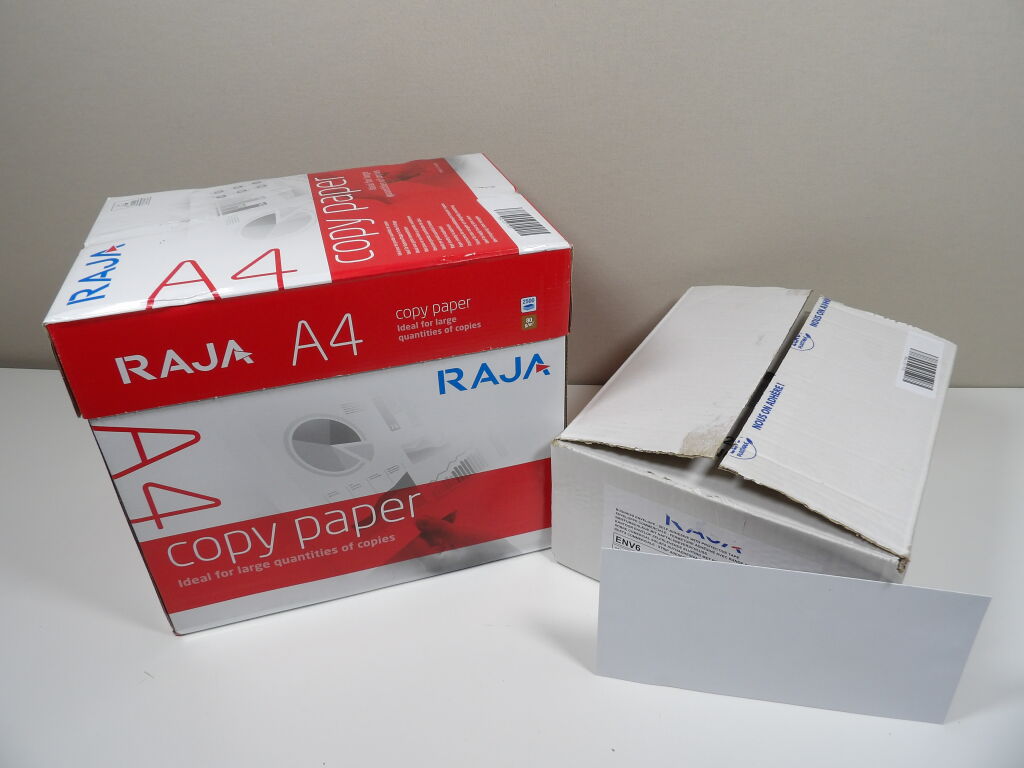 PAPETERIE : RAJA - NEUFS - Lot de 500 enveloppes blanches (110x220 mm / 80 g/m2) avec fermeture adhésive bande protectrice. Et Ramette de Papier x2500 feuilles en A4 - 80g/m2.