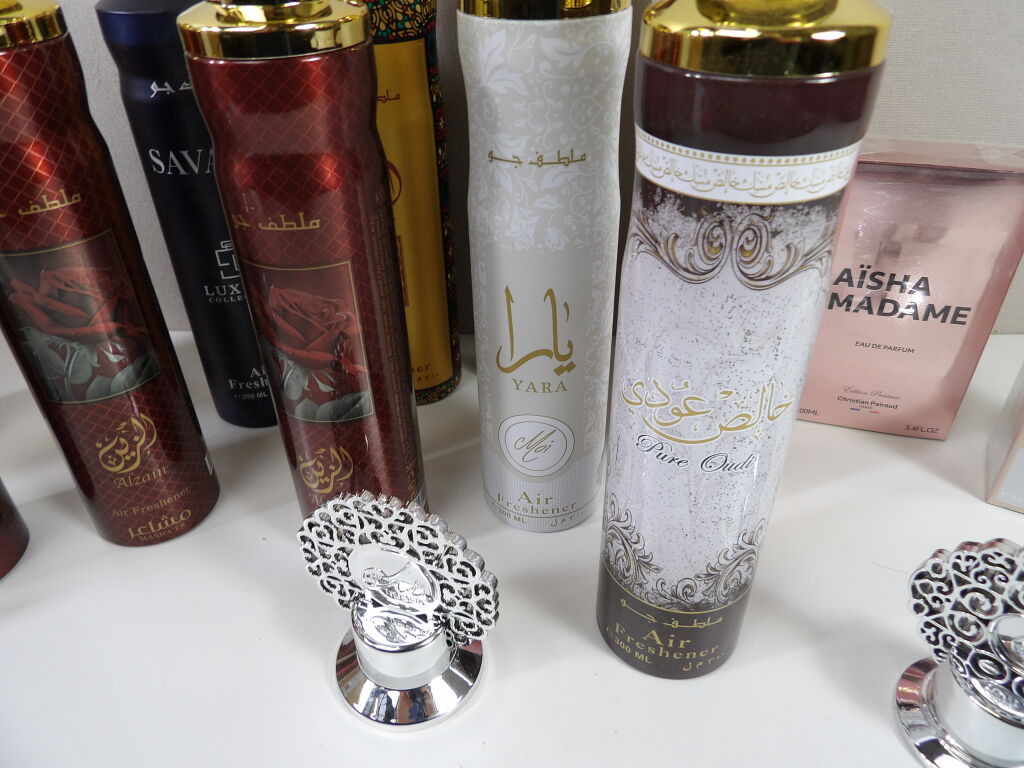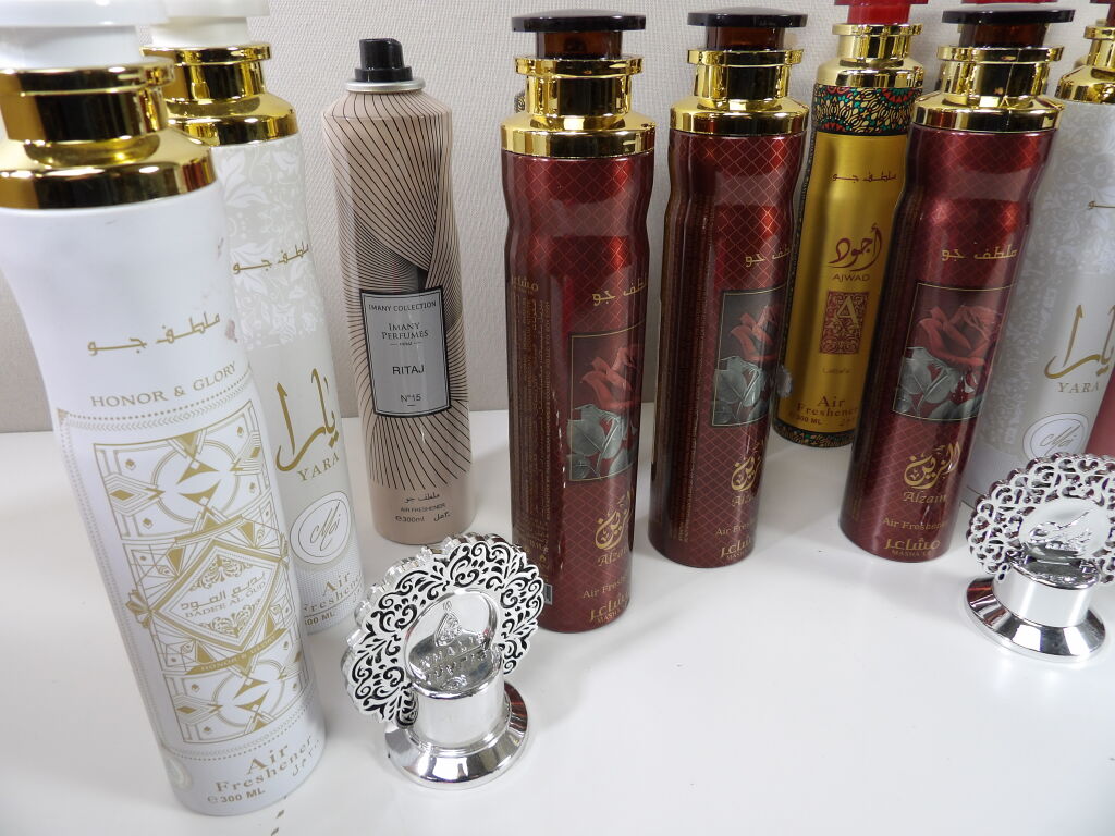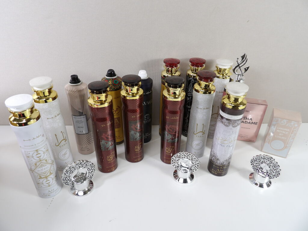 PARFUMS D'INTERIEUR ORIENTAUX : Lot de x14 désodorisants neufs et occasion : Yara, Lattafa, Masha'er.... On y inclut x2 Eaux de parfum Laxuria et Aïsha Madame.