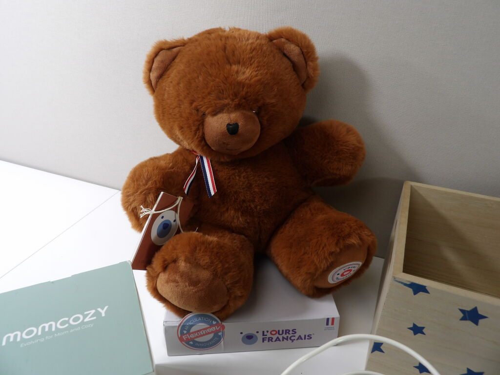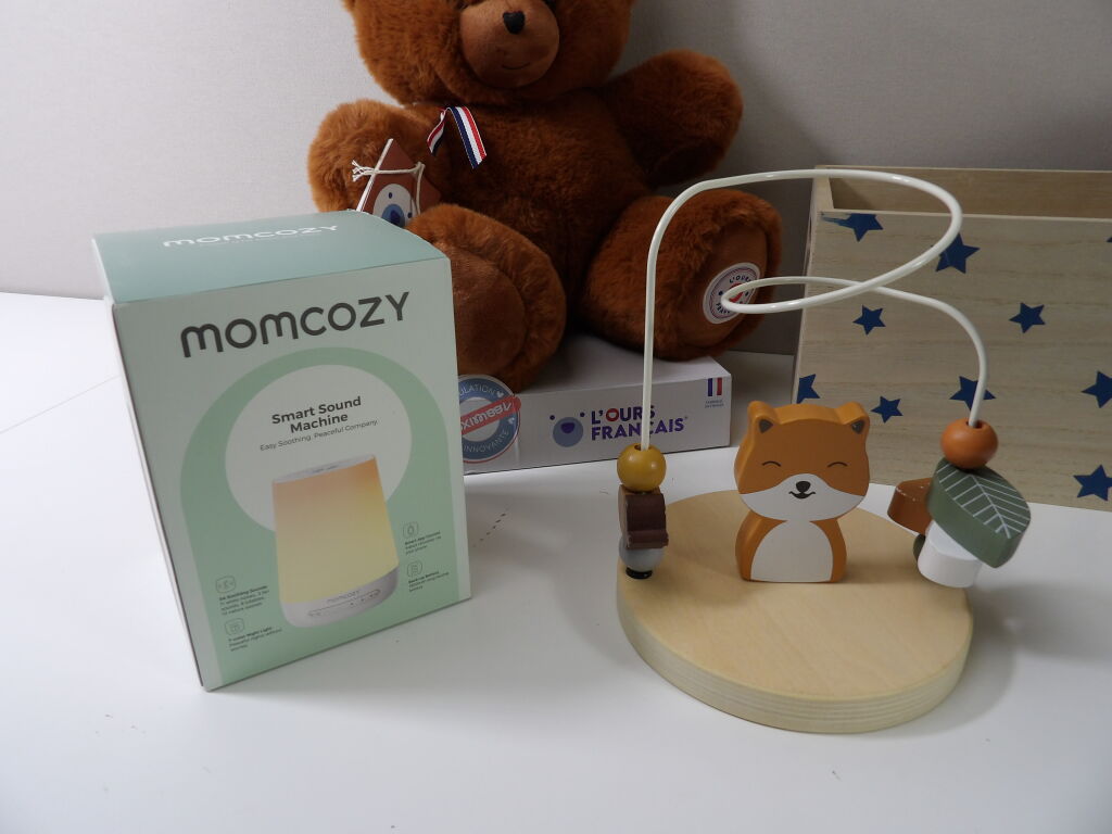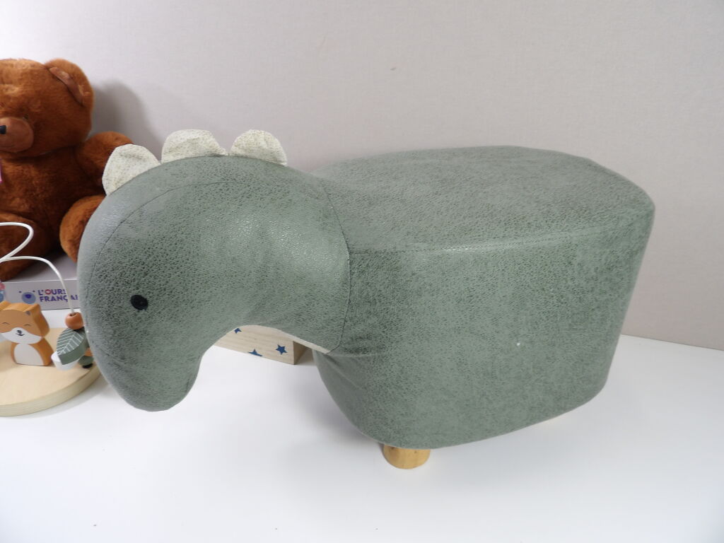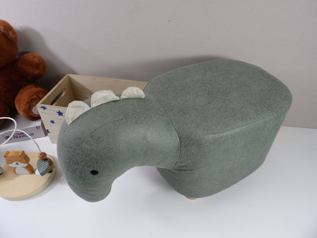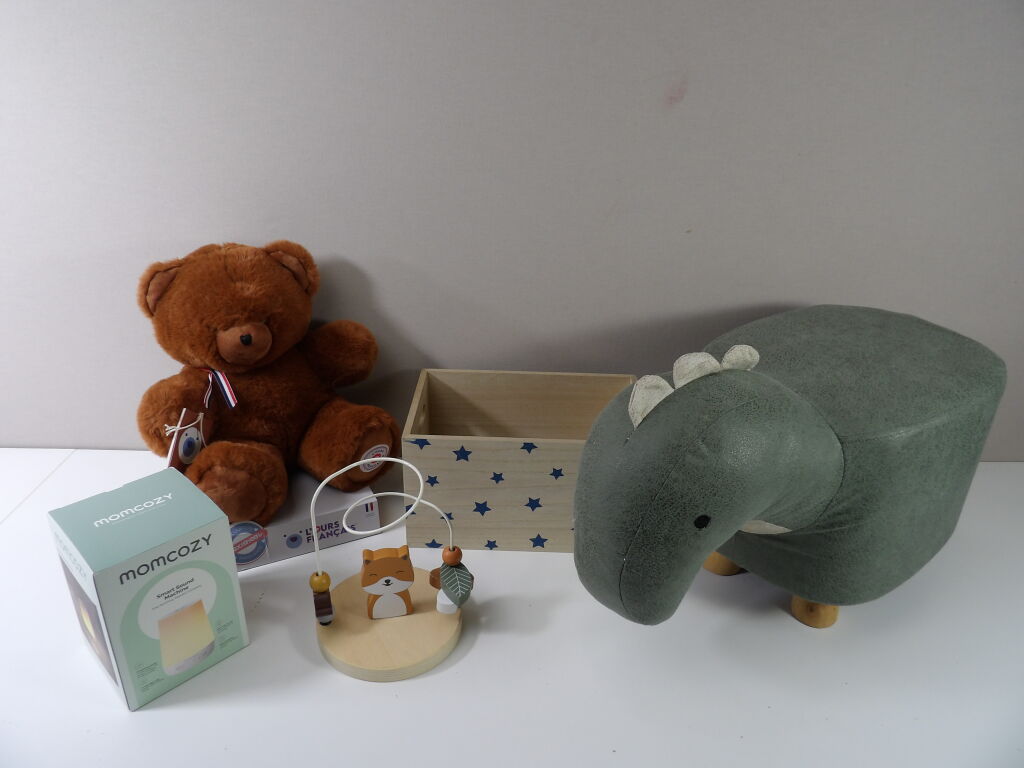 PUERICULTURE x5 Petits jeux et autres d'occasion et neufs: Tabouret Dinosaure, Jeu d'éveil, Veilleuse Momcozy, Nounours français et petite boite de rangement.