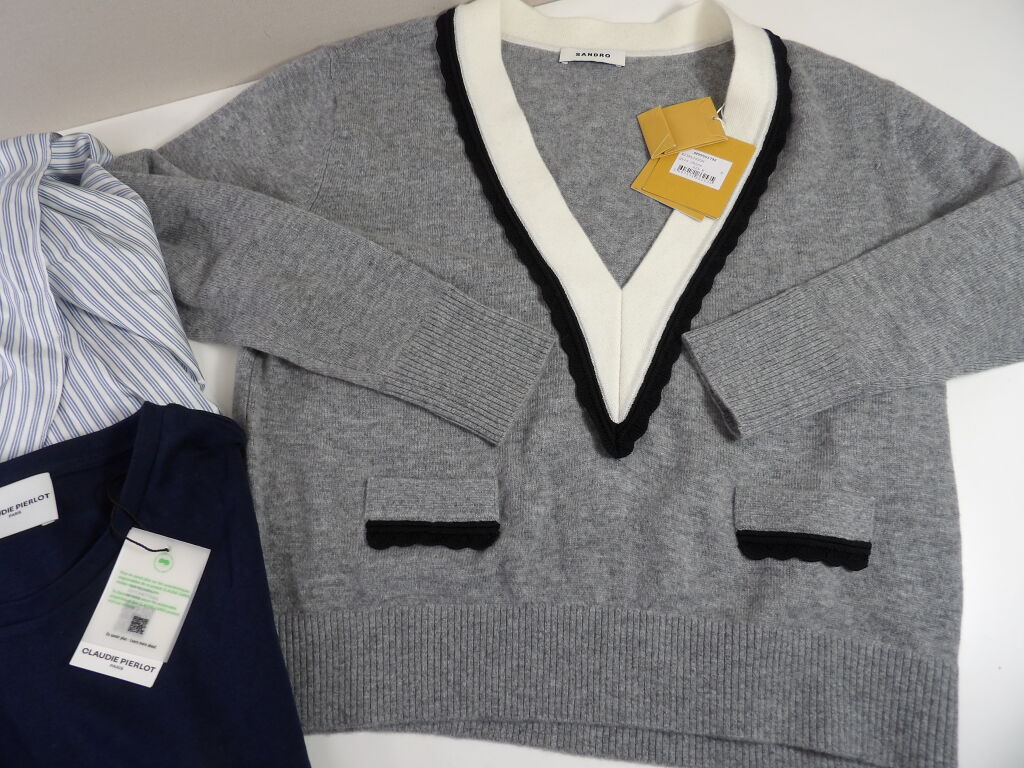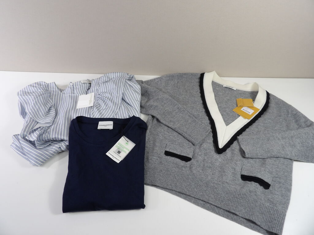 SANDRO et CLAUDIE PIERLOT Taille 0 / XS : Lot de x3 vêtements FEMME neufs ! x1 Pull et x1 jolie blouse rayée SANDRO; ainsi qu'un tshirt basic CLAUDIE PIERLOT.