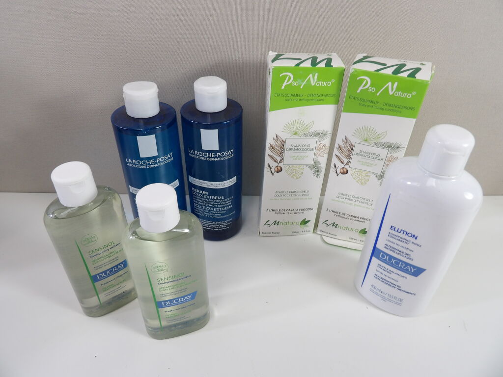 SOINS CHEVEUX Lot de x7 articles neufs et d'occasion descellés: Shampoings Pso Natura, Ducray, La Roche-Posay.