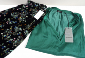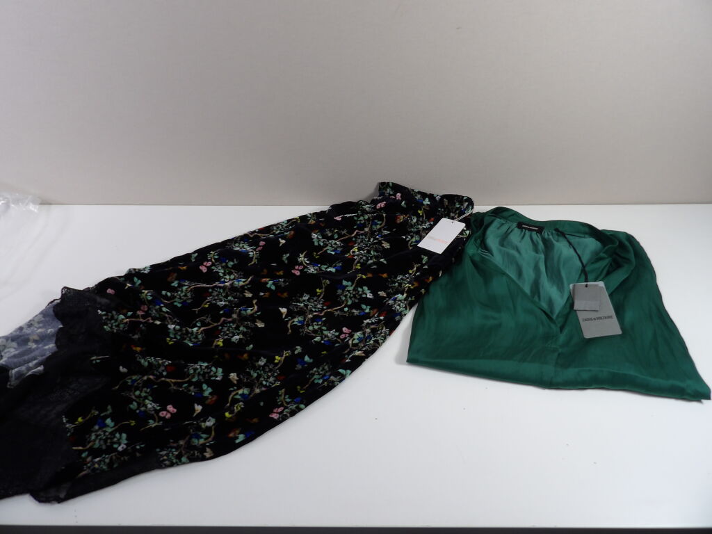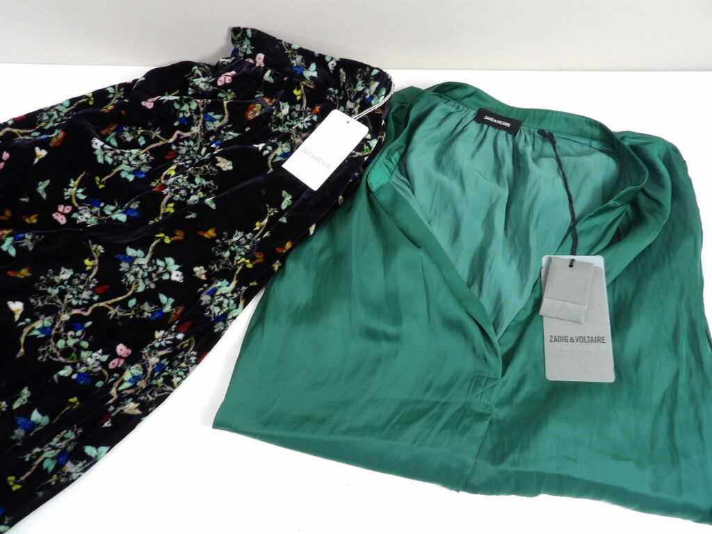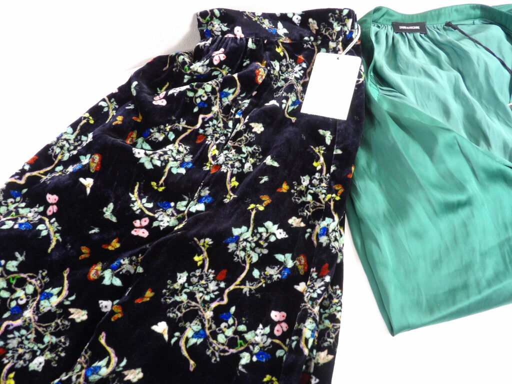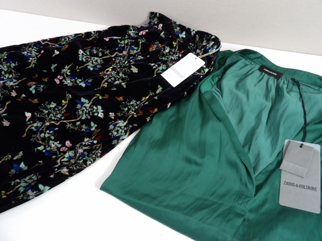 ZADIG & VOLTAIRE : Un ensemble jupe fleurie en velours avec son top chemisier vert satiné, en taille L. NEUFS!