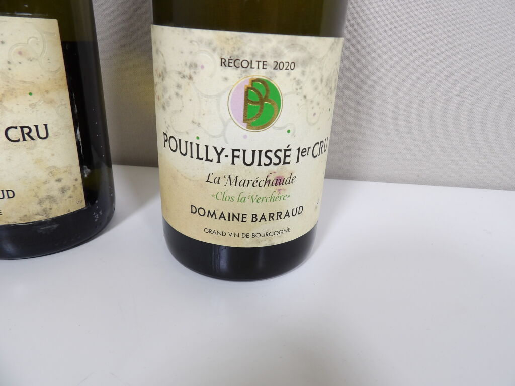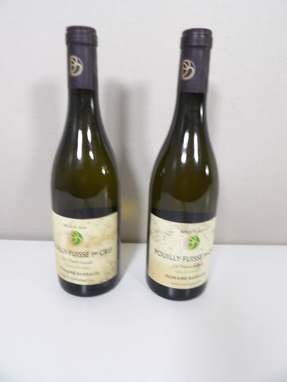 2 bouteilles de Pouilly-Fuissé 1er Cru La Maréchaude "Clos la Verchère" domaine Barraud récolte 2020 (étiquettes tâchées).