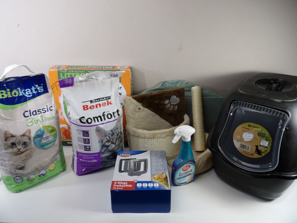 CHAT : Lot comprenant 6 articles neufs et occasion : Arbre à chat (attention manque la visserie), Chatière TRIXIE, x2 paquets de litière, Kit entrainement pour aller au WC et litière (attention la porte est cassée).