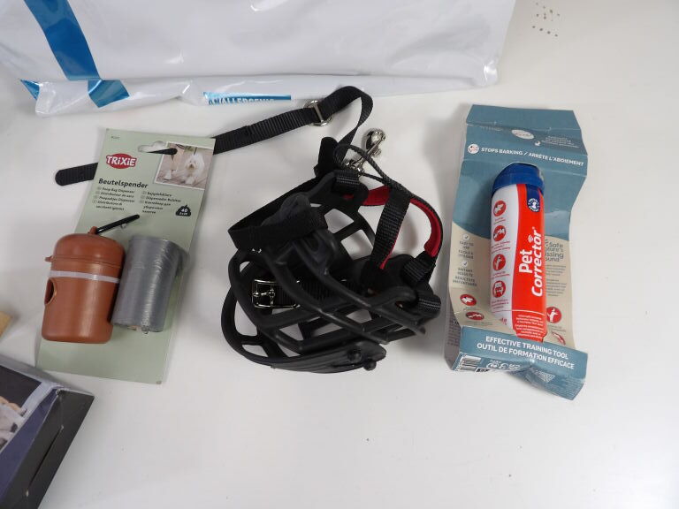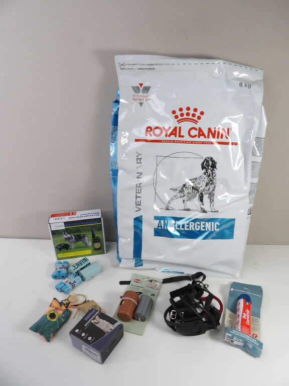 CHIEN : Lot comprenant 8 articles principalement neufs et occasion : Royal Canin Croquettes Anallergenic 8kgs, muselière, sacs a crottes et autres.