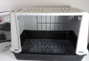 CHIEN : x2 Articles d'occasion vendus en l'état : cage de transport (grille fermeture incomplète?) et petite maison DOGVILLA (dimensions extérieure 43x48x44cm.