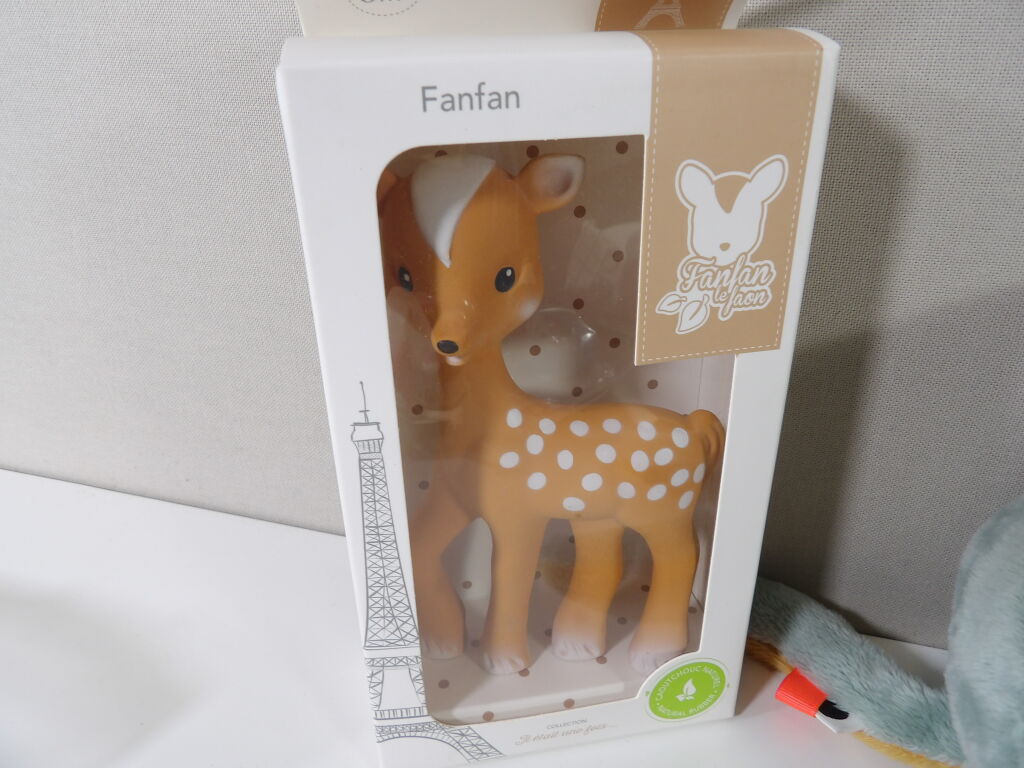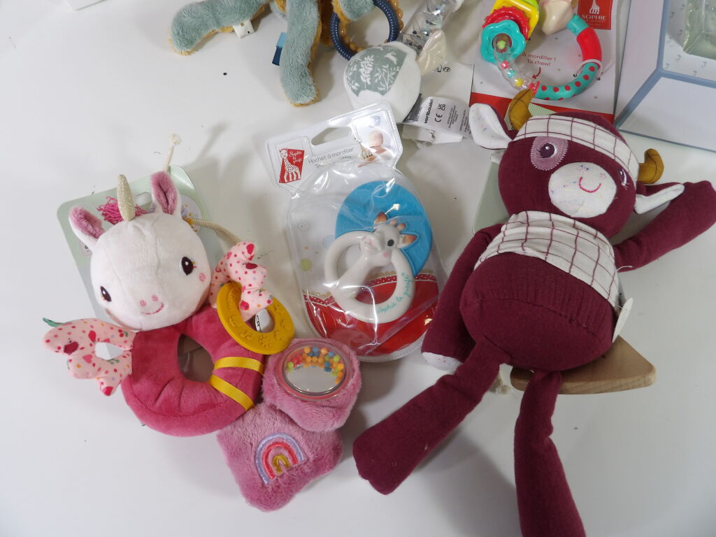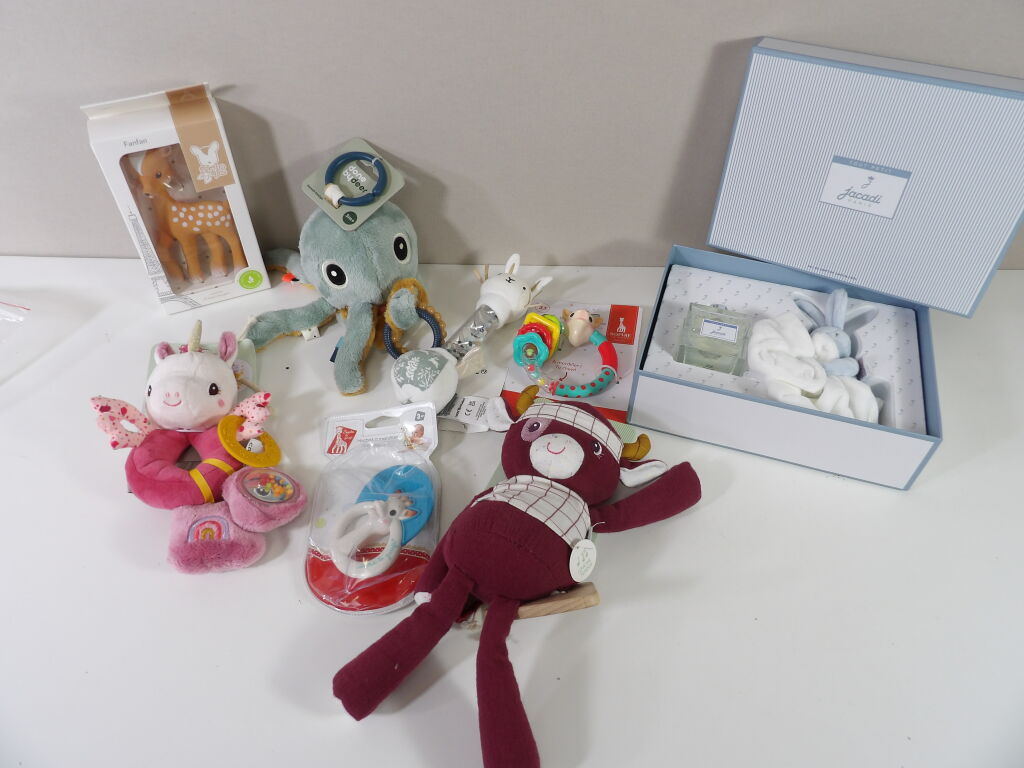 JACADI Coffret Tout Petit Eau de senteir 100ML + son doudou lapin; Fanfan Le faon, Liliputiens ROSALIE Peluche musicale et LENA Animal multi activités; DONE BY DEE Peluche multi activités, x2 Sophie La Griafe hochets et x1 VERBAUDET baton de pluie.