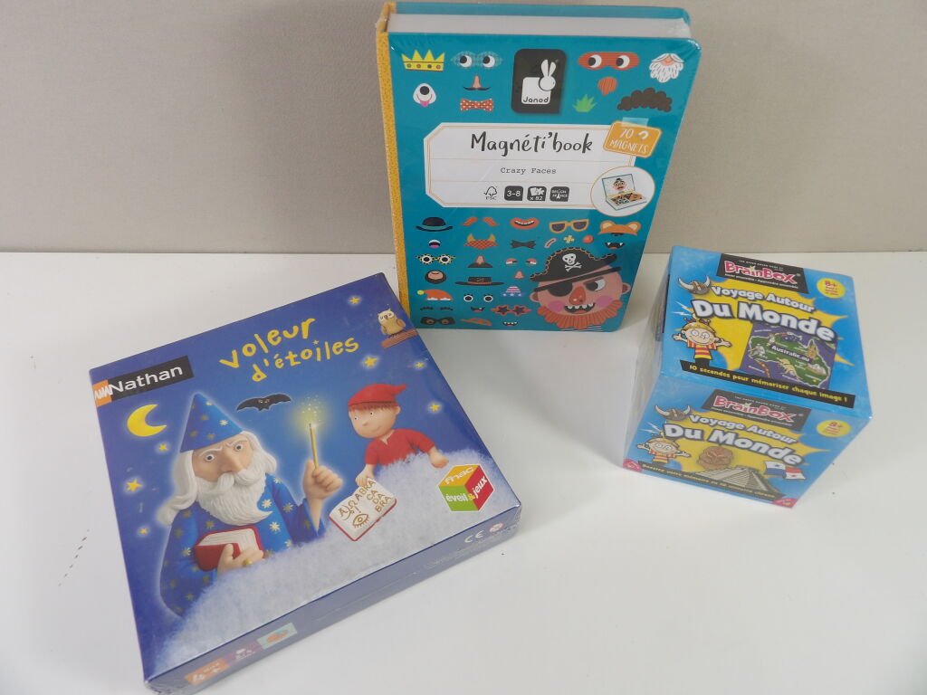 JEUX ENFANTS Lot de x3 jeux neufs (sous blisters) : Voyage autour du Monde Brainbox, MagnétikBook crazy faces et Voleur d'étoiles.