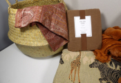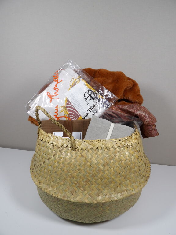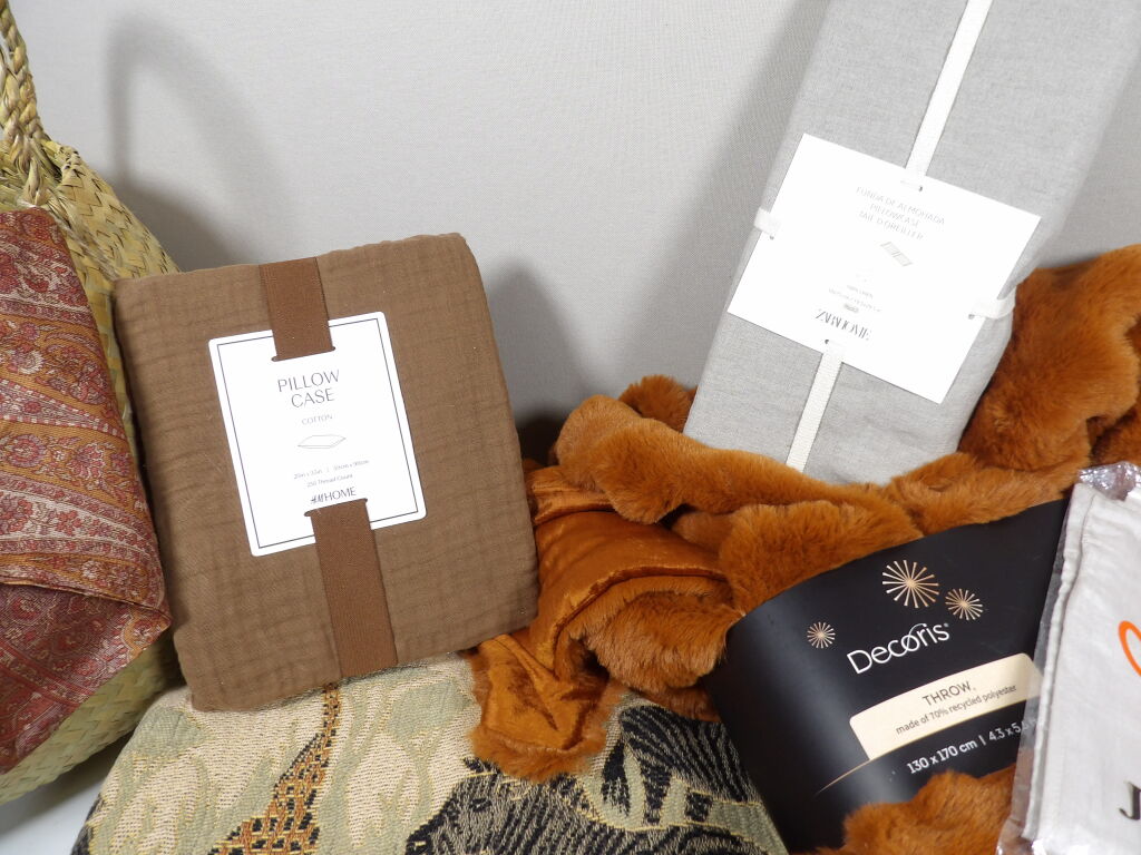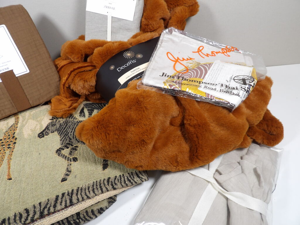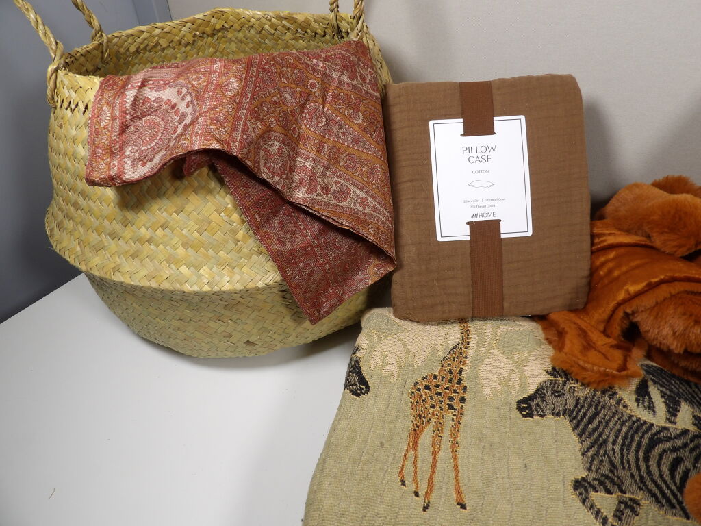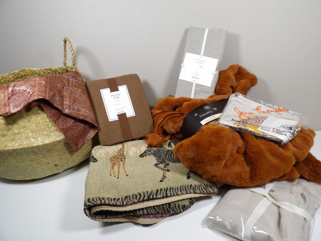 LINGE DE MAISON - Lot de 7 articles Neufs - H&M home - housse de coussin 50 x 90 cm - 2x taies d'oreiller en lin naturel 65 x 65 cm - Jim Thompson: housse de coussin en soie - Zara home - taies d'oreiller en lin 50x75 cm - Plaid tout doux en fausse fourrure coloris brique 130 x 170 cm - Panier tressé - 1x tapis léger ou dessus de lit à motif jungle
