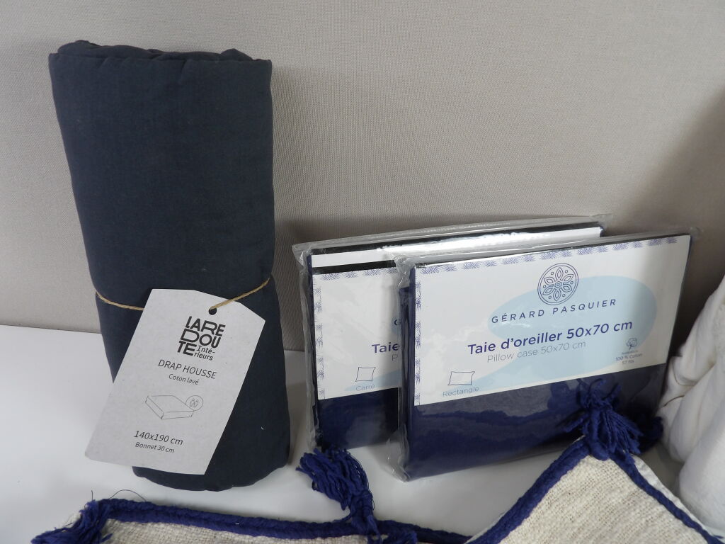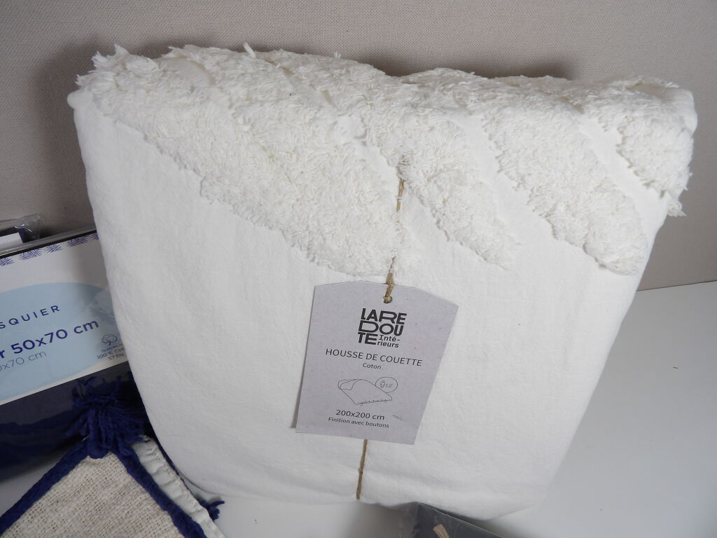 LINGE DE MAISON x7 articles : Housse de couette 200x200cm (finition avec boutons) et drap housse coton lavé 140x190cm LA REDOUTE, ainsi que x5 taies d'oreillers dont 2 de coussins ALINEA.