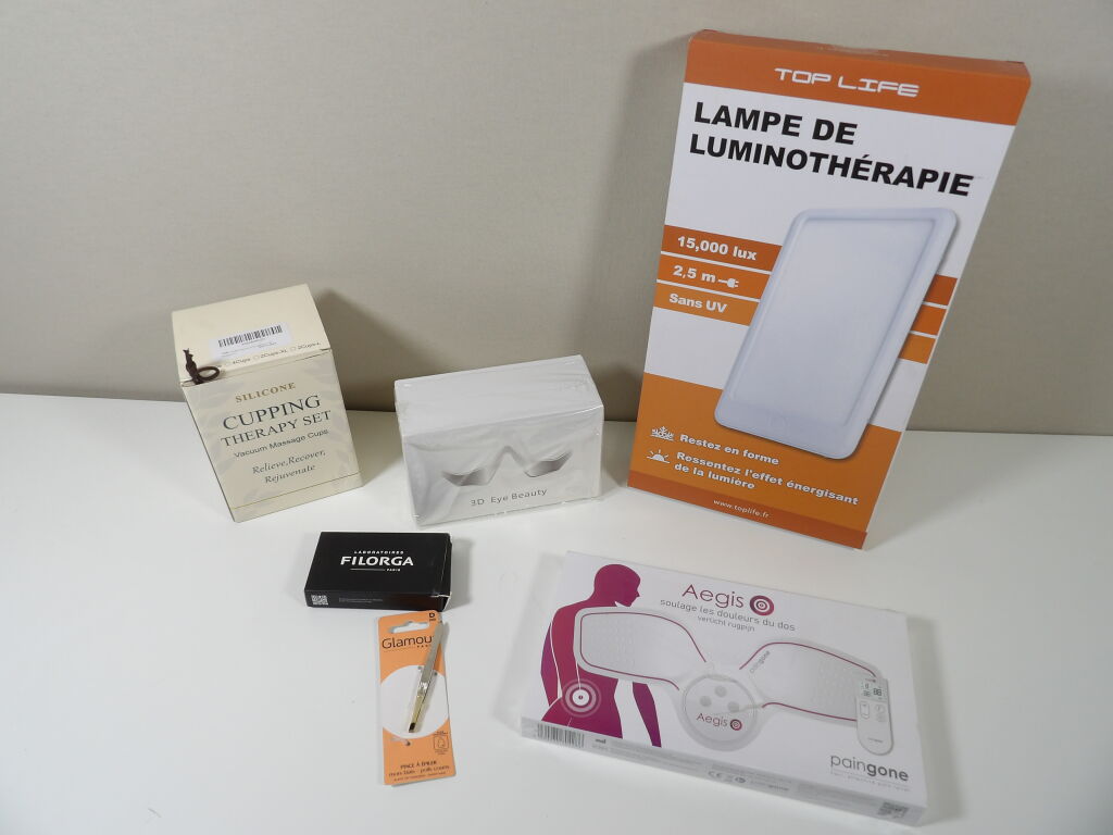 Lot de x5 articles pour maquillage et autres : dont Guasha LABORATOIRES FILORGA, Lampe de luminothérapie, 3D EYE BEAUTY, Aegis soulage les douleurs du dos ....