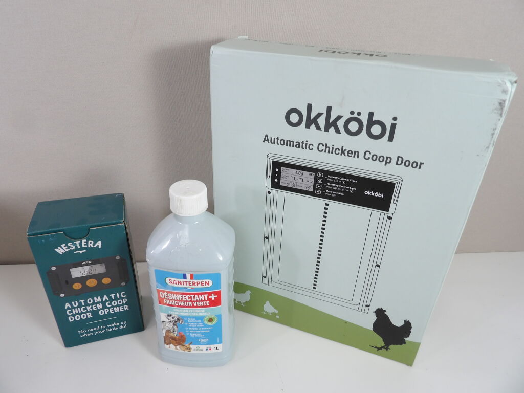 POULES : Lot de x2 Portes de poulailler automatique d'occasion (NON testés vendus en l'état) et x1 Désinfectant + fraicheur verte de 1L.