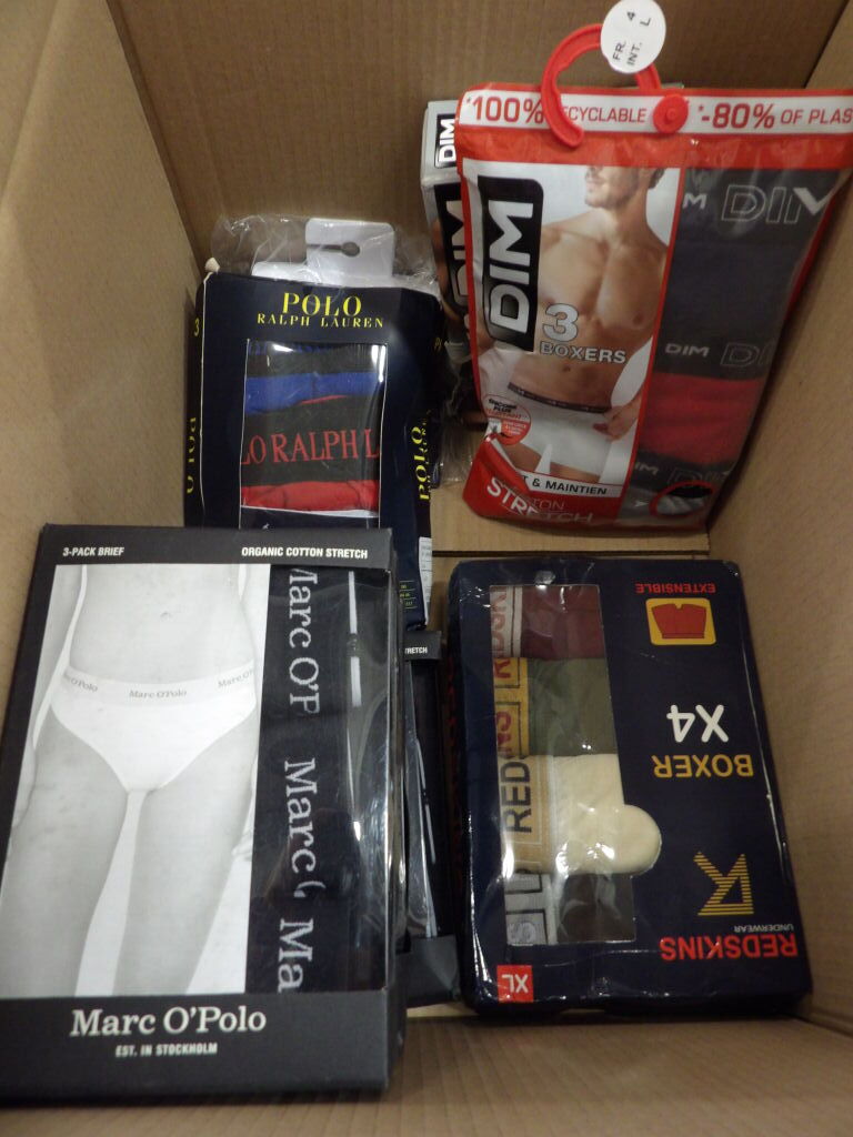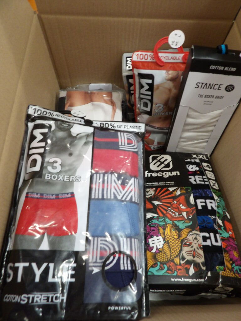 POUR HOMME NEUF : Lot de x35 PACKS et autres de CULOTTES / CALECONS - Principalement DIM, et d'autres marques présentes - voir photos. Différentes marques, modèles et tailles.