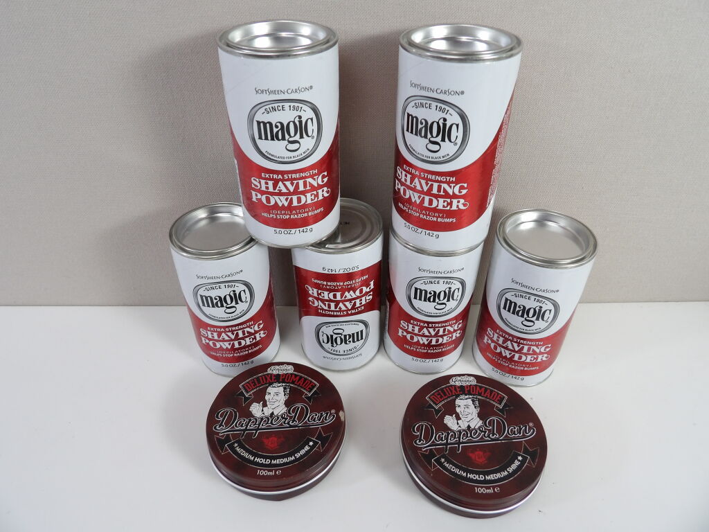 POUR HOMME x8 articles neufs : x2 DELUXE POMMADE - Dapper Dan cire à cheveux de 100ML; et x6 Poudre RASAGE Magic 142g.